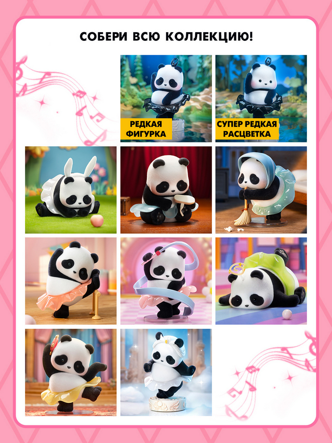 Панда Ролл – серия фигурок-сюрпризов, посвящённая милым плюшевым друзьям – пандам. Особенностью данной серии является перевоплощение уже знакомых нам персонажей Панда Ролл и Цзюань Бао в звёзд балета. Юбочка с глянцевым эффектом воссоздаёт эффект балетной пачки, а сама фигурка стала еще более приятной на ощупь!