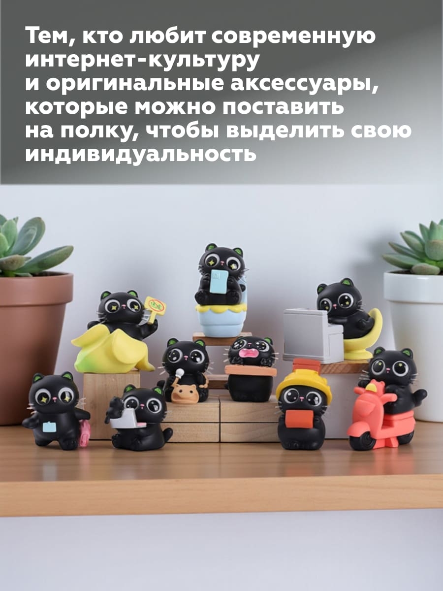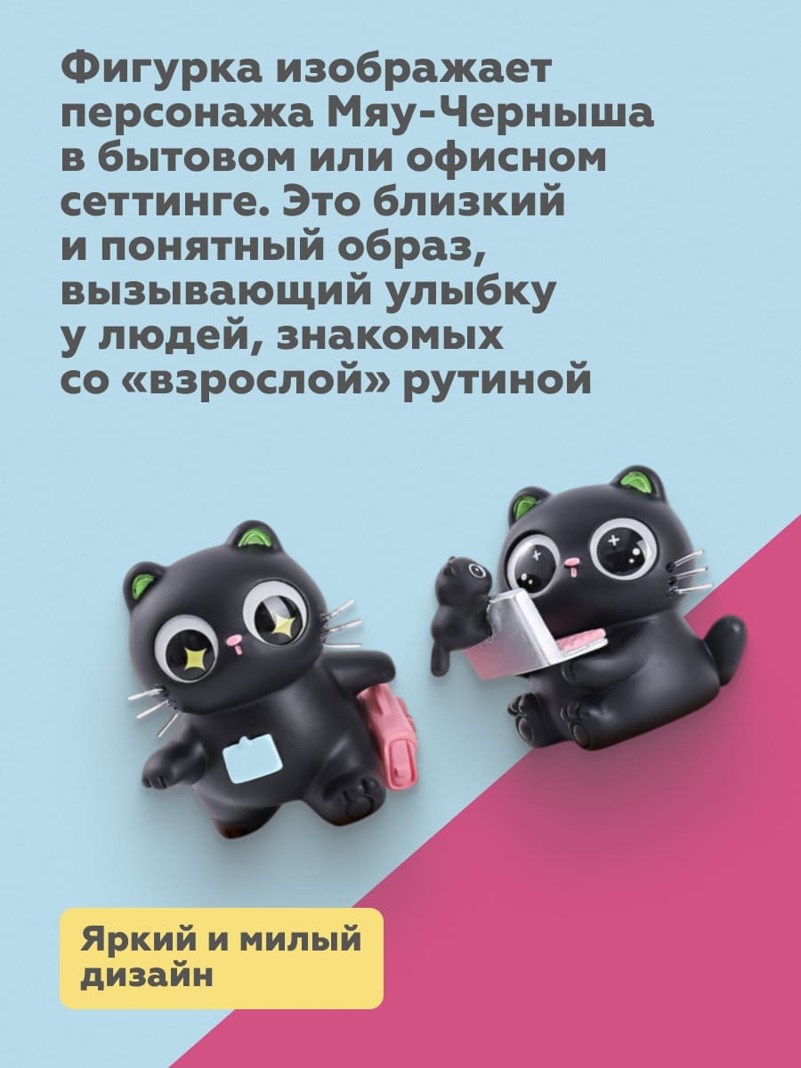 Фигурка изображает персонажа Мяу-Черныша в бытовом или офисном сеттинге. Это близкий и понятный образ, вызывающий улыбку у людей, знакомых с "взрослой" рутиной.