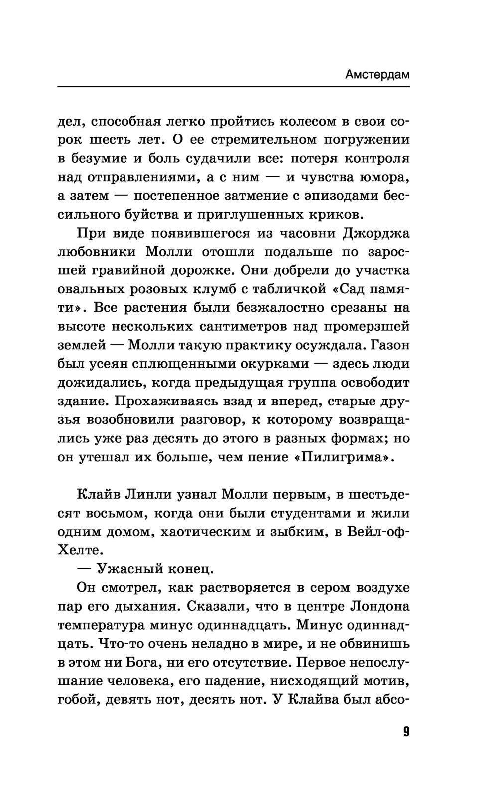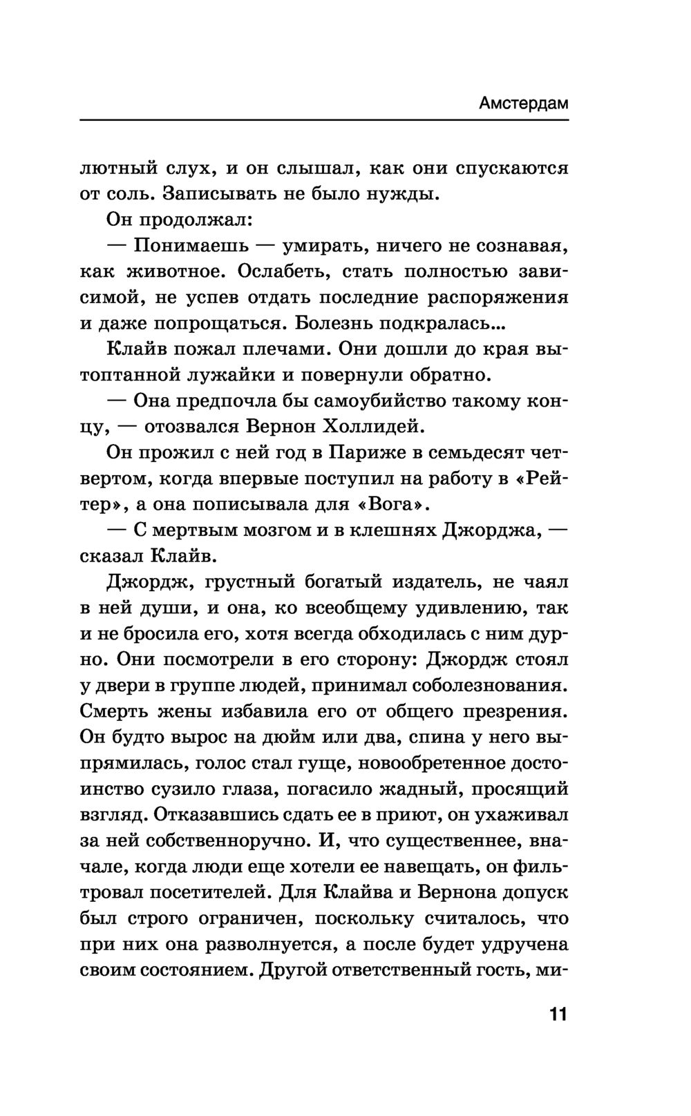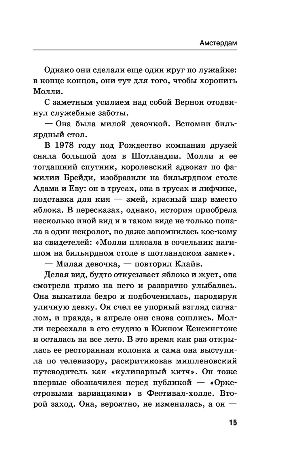 Иэн Макьюэн – один из авторов "правящего триумвирата" современной британской прозы (наряду с Джулианом Барнсом и Мартином Эмисом). Его "Амстердам" получил Букеровскую премию. Русский перевод романа стал интеллектуальным бестселлером, а работа Виктора Голышева была отмечена российской премией "Малый Букер", в первый и единственный раз присужденной именно за перевод. Двое друзей – преуспевающий главный редактор популярной ежедневной газеты и знаменитый композитор, работающий над "Симфонией тысячелетия", – заключают соглашение об эвтаназии: если один из них впадет в состояние беспамятства и перестанет себя контролировать, то другой обязуется его убить...