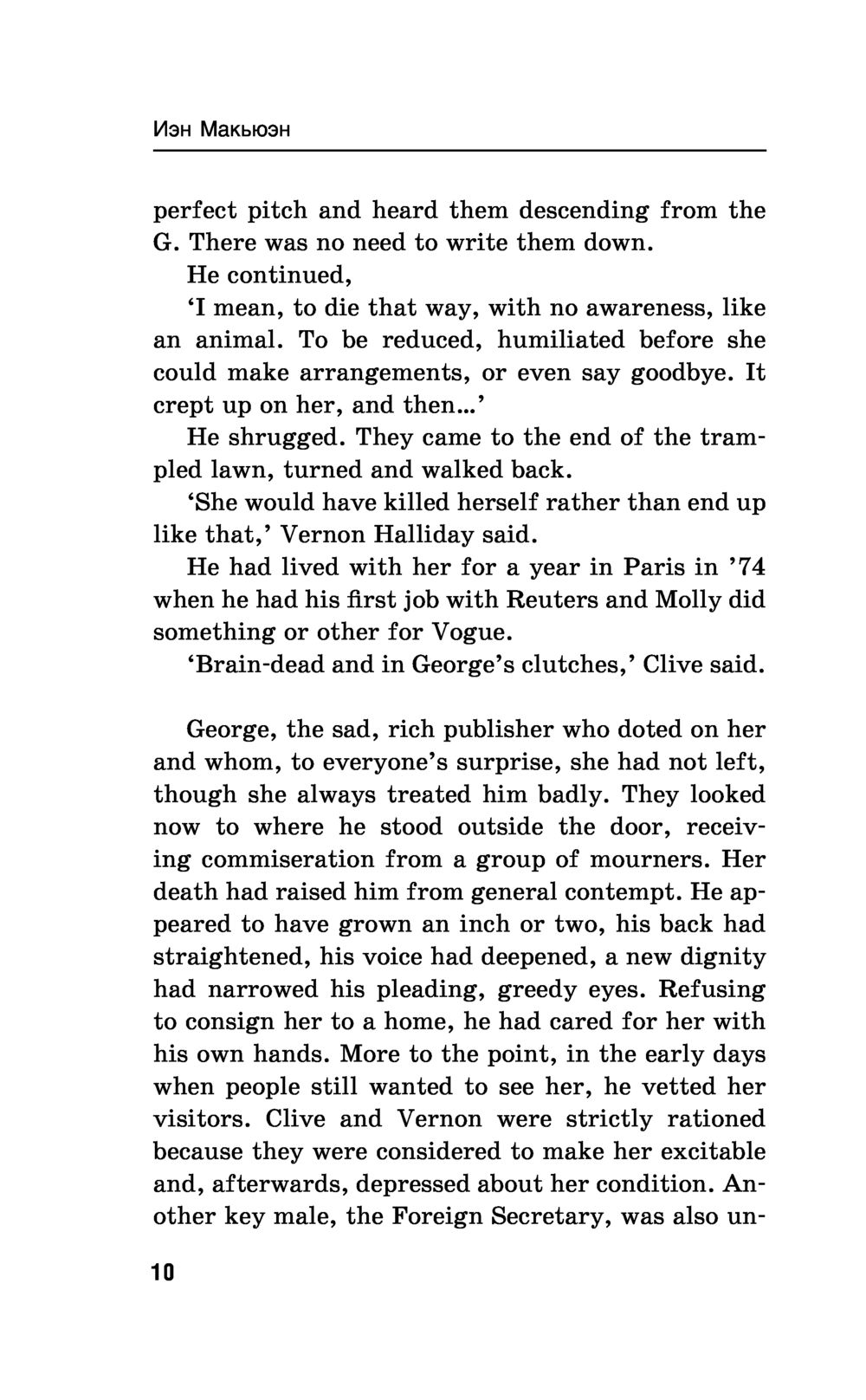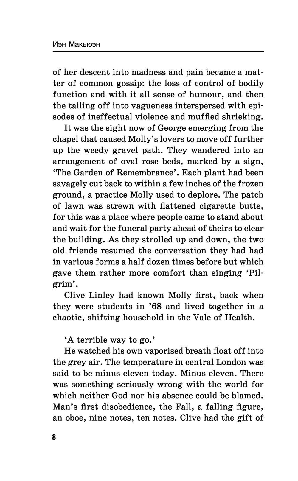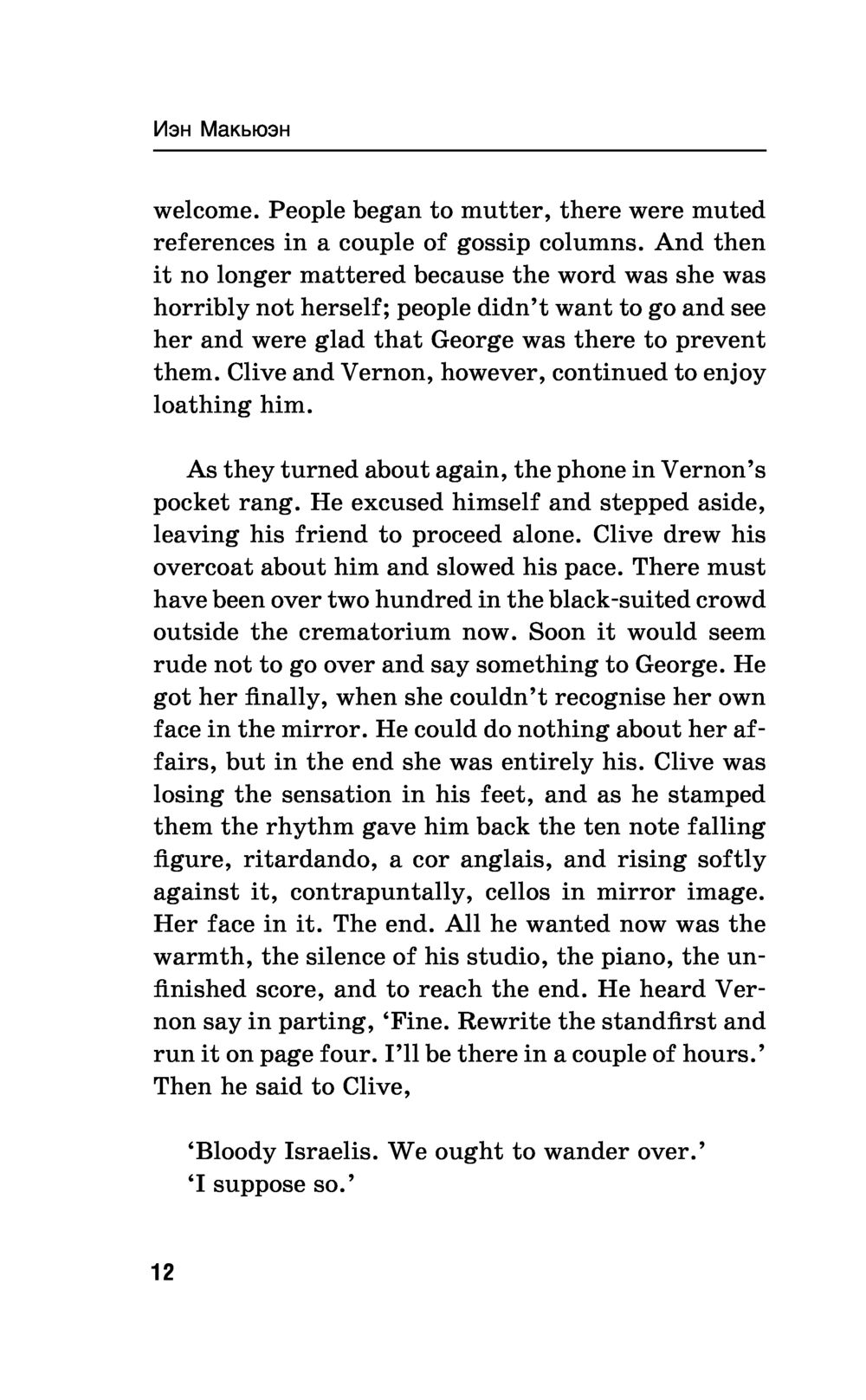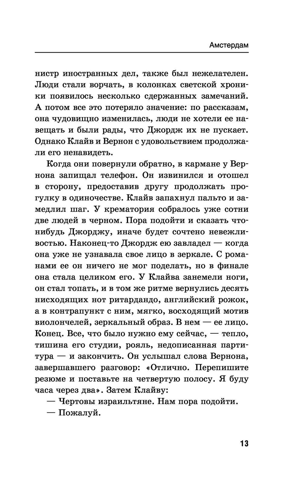 Иэн Макьюэн – один из авторов "правящего триумвирата" современной британской прозы (наряду с Джулианом Барнсом и Мартином Эмисом). Его "Амстердам" получил Букеровскую премию. Русский перевод романа стал интеллектуальным бестселлером, а работа Виктора Голышева была отмечена российской премией "Малый Букер", в первый и единственный раз присужденной именно за перевод. Двое друзей – преуспевающий главный редактор популярной ежедневной газеты и знаменитый композитор, работающий над "Симфонией тысячелетия", – заключают соглашение об эвтаназии: если один из них впадет в состояние беспамятства и перестанет себя контролировать, то другой обязуется его убить...