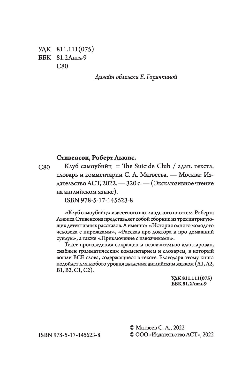 Вы держите в руках книгу под названием "Клуб самоубийц" известного шотландского писателя Роберта Льюиса Стивенсона, которая представляет собой сборник из трех интригующих детективных рассказов. А именно: "История одного молодого человека с пирожками", "Рассказ про доктора и про домашний сундук", а также "Приключение с извозчиками".