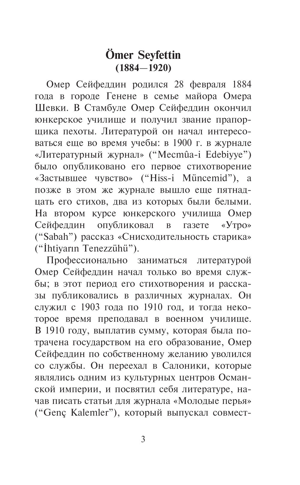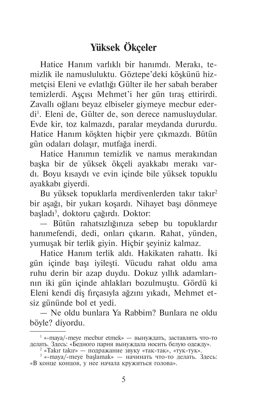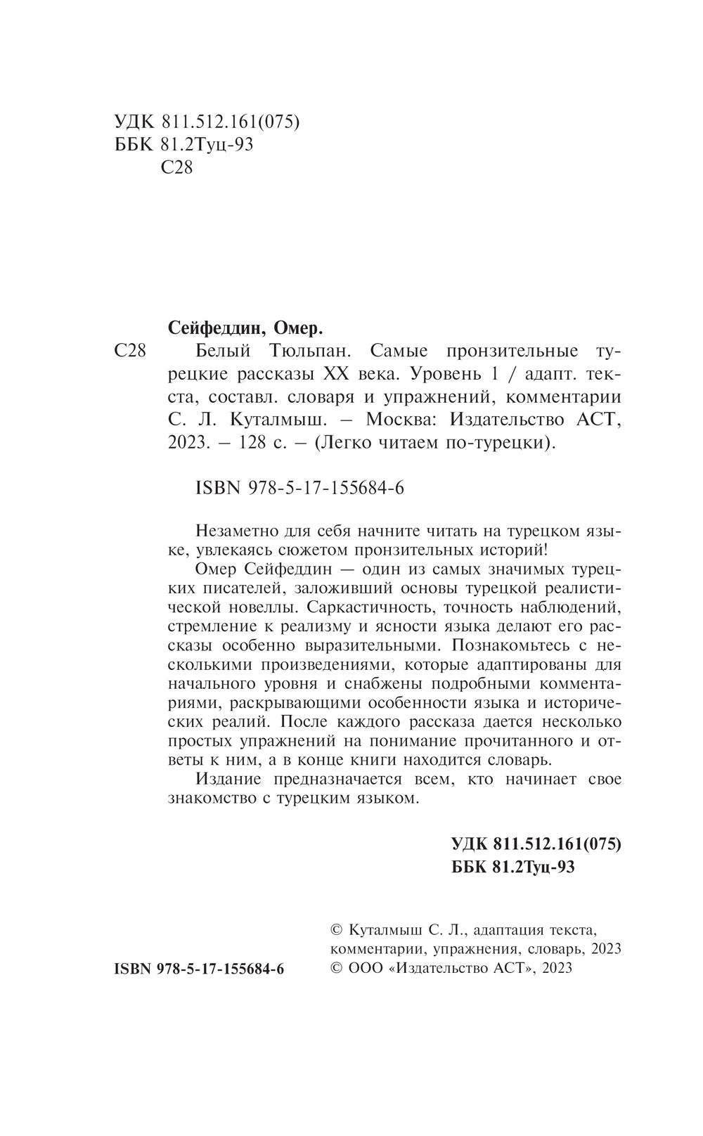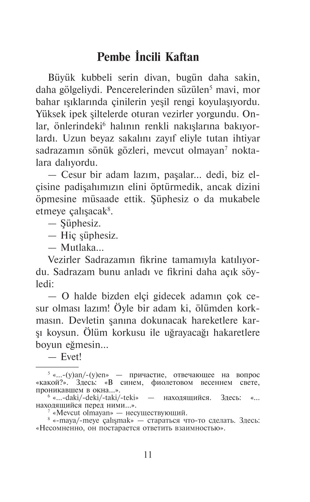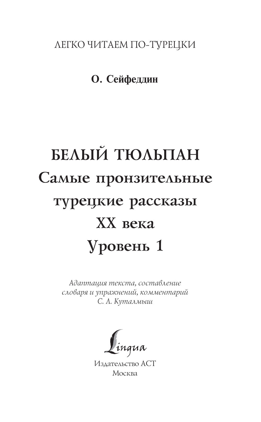Омер Сейфеддин – один из самых значимых турецких писателей, заложивший основы турецкой реалистической новеллы. Саркастичность, точность наблюдений, стремление к реализму и ясности языка делают его рассказы особенно выразительными. Познакомьтесь с несколькими произведениями, которые адаптированы для начального уровня и снабжены подробными комментариями, раскрывающими особенности языка и исторических реалий. После каждого рассказа дается несколько простых упражнений на понимание прочитанного и ответы к ним, а в конце книги находится словарь.