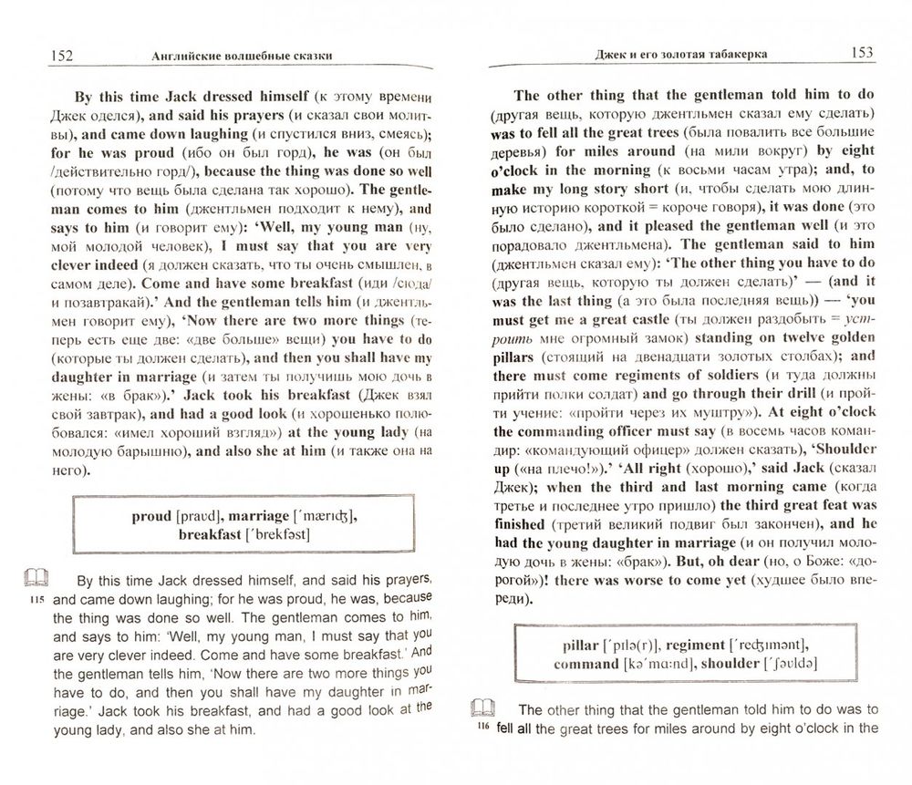 В книге представлены лучшие сказки из собрания известного знатока английского фольклора Джозефа Джейкобса (1854-1916), адаптированные по методу обучающего чтения Ильи Франка: снабжены дословным переводом на русский язык и необходимым лексико-грамматическим комментарием (без упрощения текста оригинала).