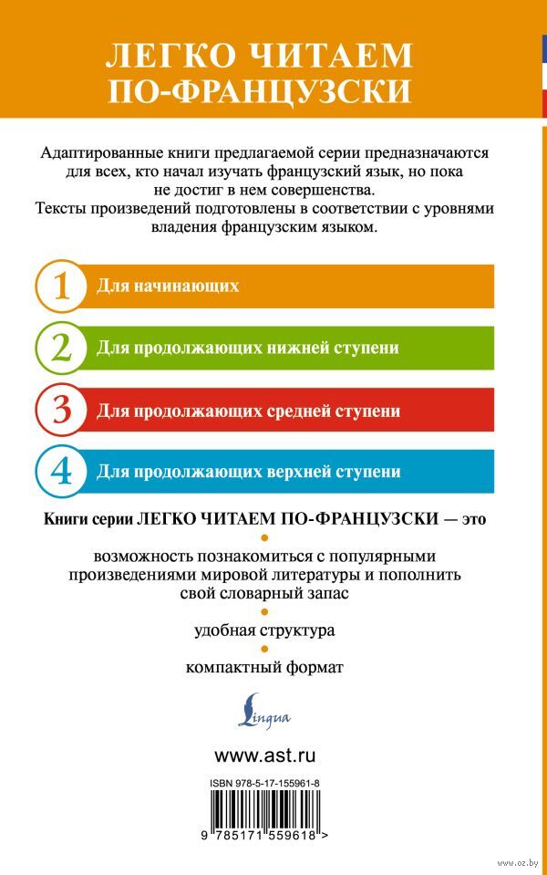 Произведение представлено в адаптации, в нем сохранены основные сюжетные линии и характеры, а текст упрощен для облегчения чтения и понимания. В книге используется базовая лексика и грамматика, что делает ее идеальной для тех, кто только начинает изучать французский язык и хочет познакомиться с шедеврами мировой литературы в оригинале.