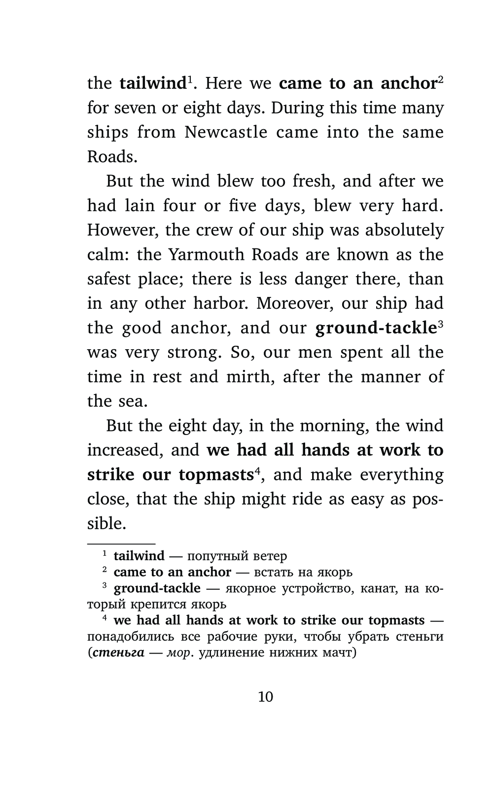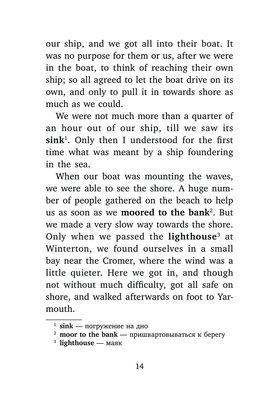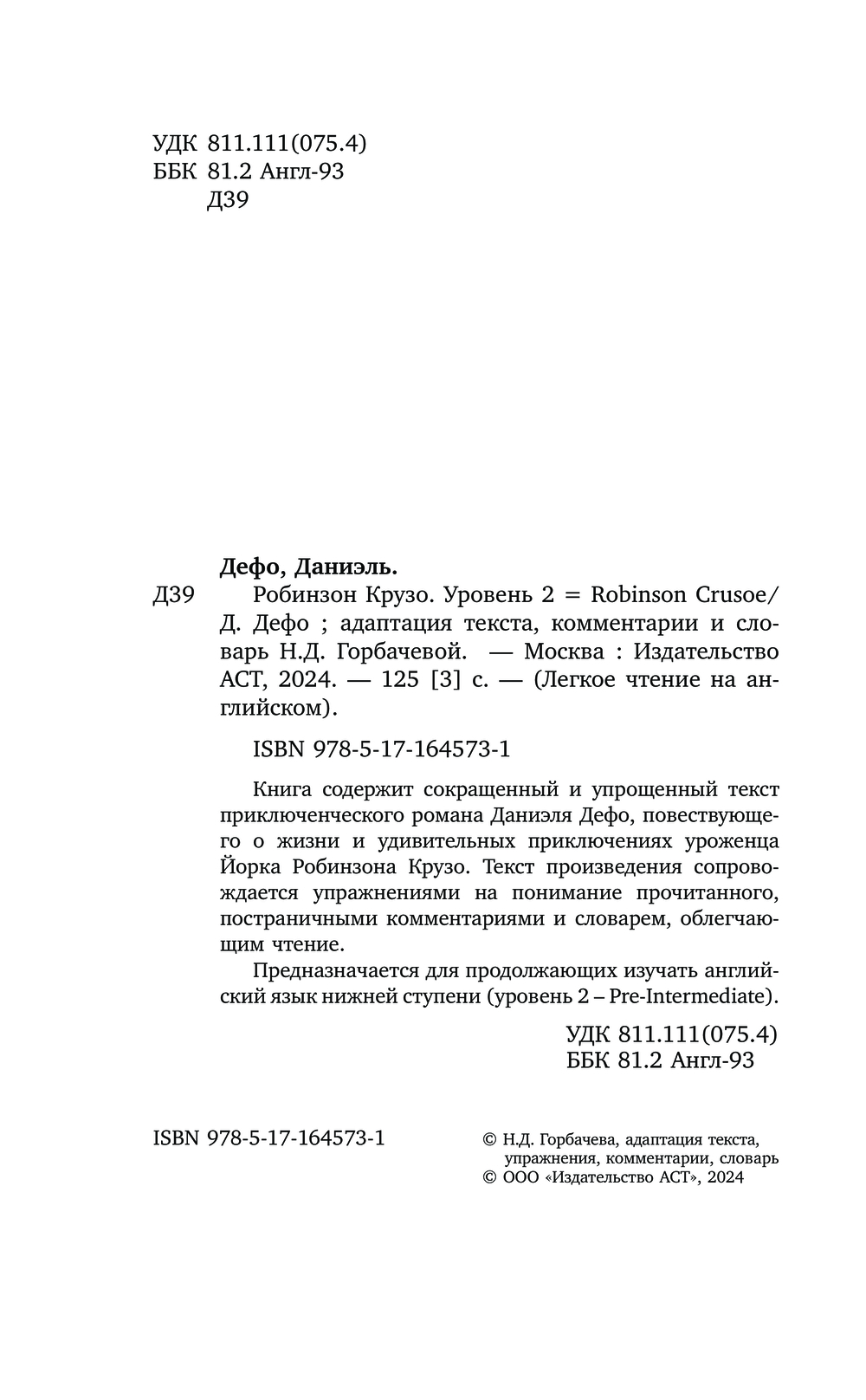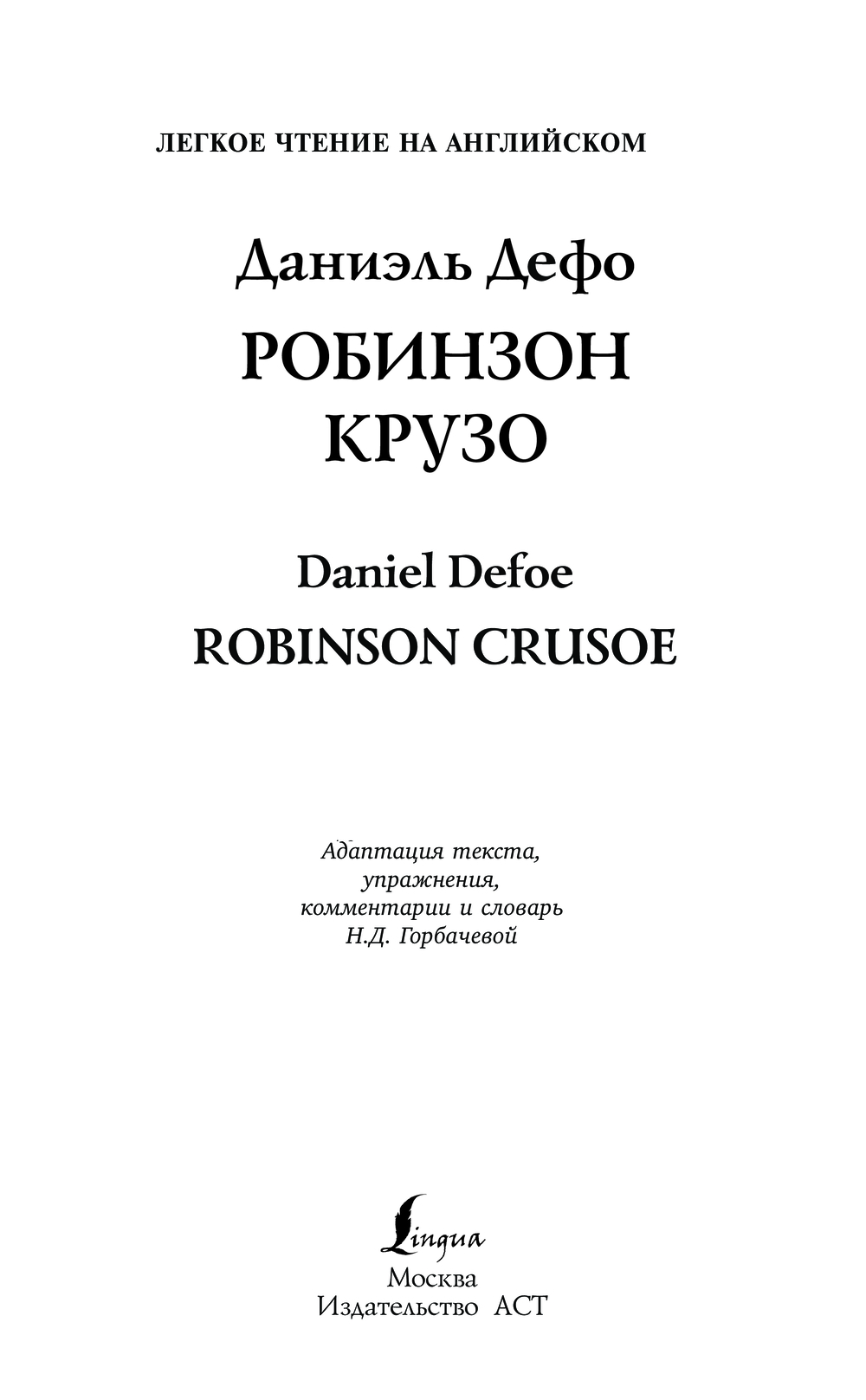 Книга содержит сокращенный и упрощенный текст приключенческого романа Даниэля Дэфо, повествующего о жизни и удивительных приключениях уроженца Йорка Робинзона Крузо. Текст произведения сопровождается упражнениями на понимание прочитанного, постраничными комментариями и словарем, облегчающим чтение.