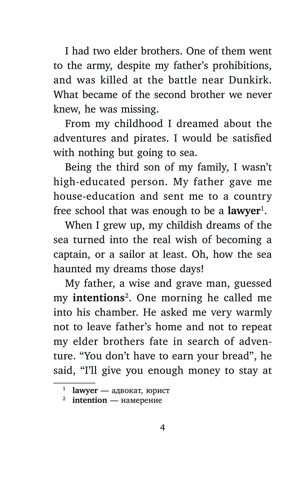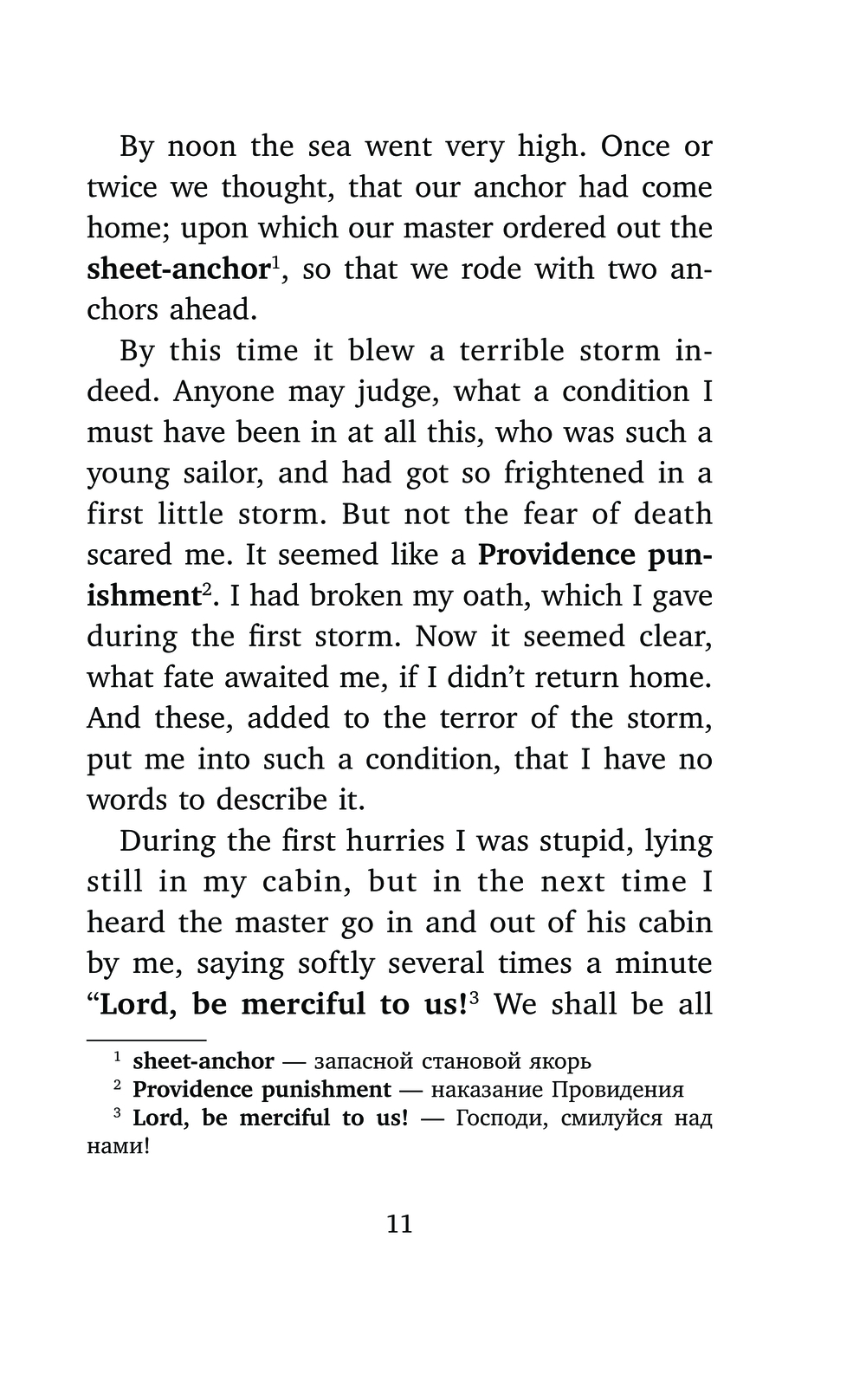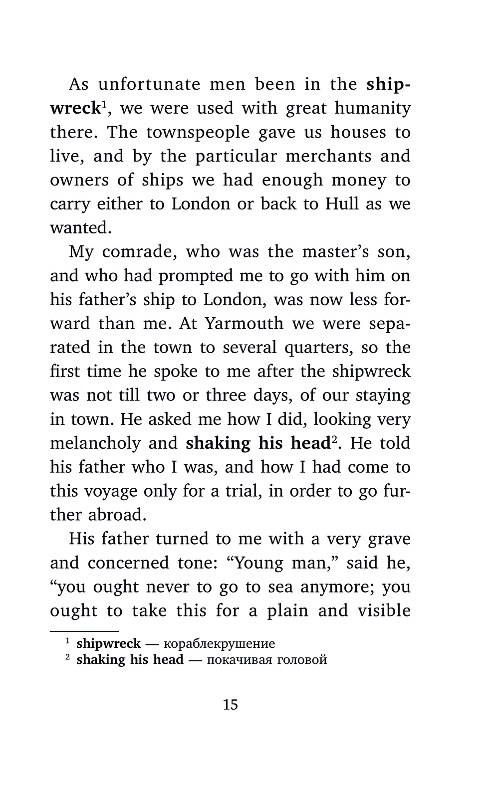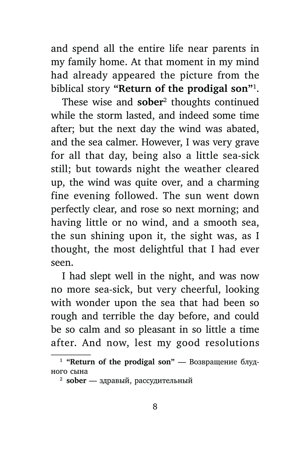 Книга содержит сокращенный и упрощенный текст приключенческого романа Даниэля Дэфо, повествующего о жизни и удивительных приключениях уроженца Йорка Робинзона Крузо. Текст произведения сопровождается упражнениями на понимание прочитанного, постраничными комментариями и словарем, облегчающим чтение.