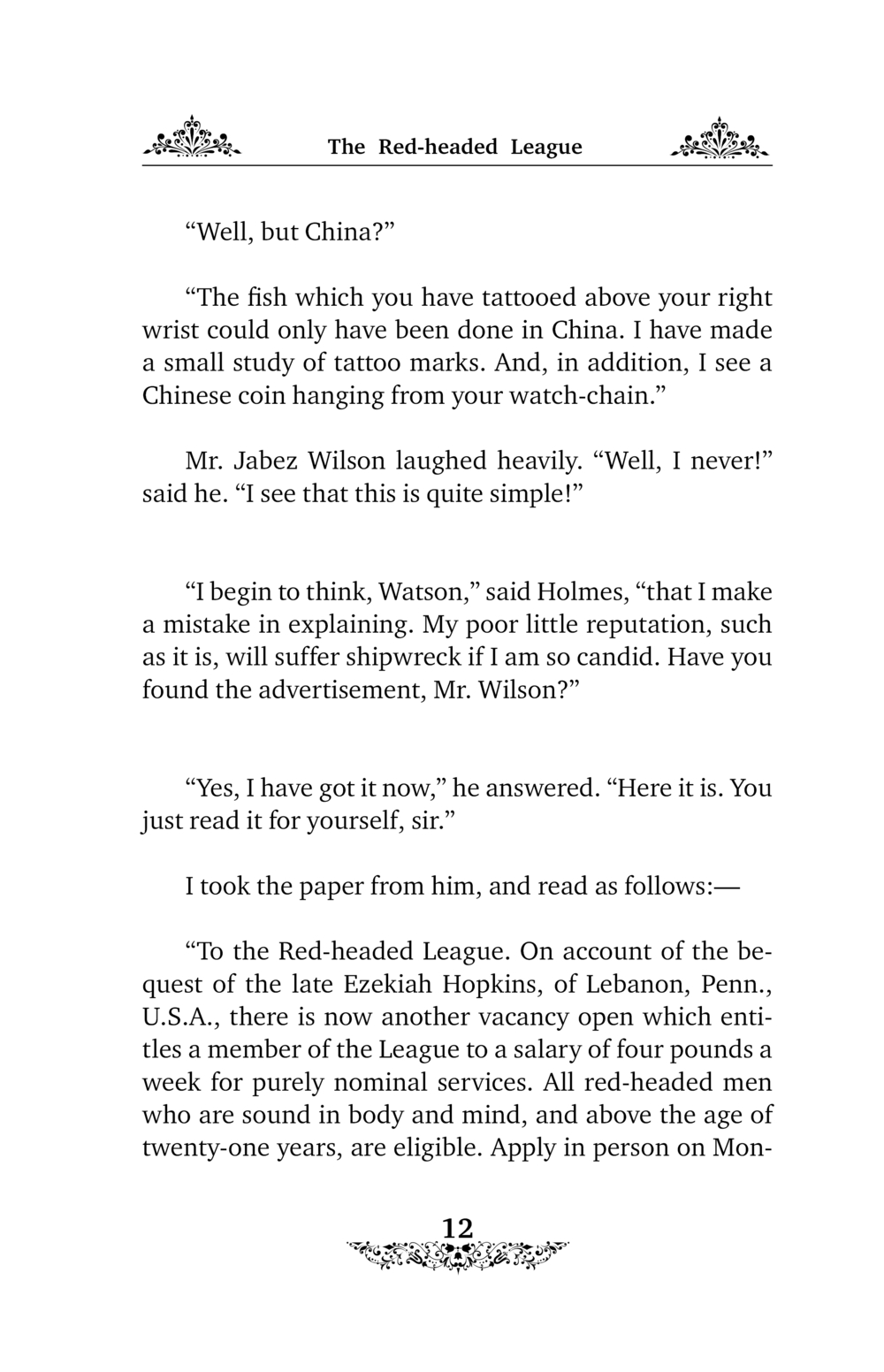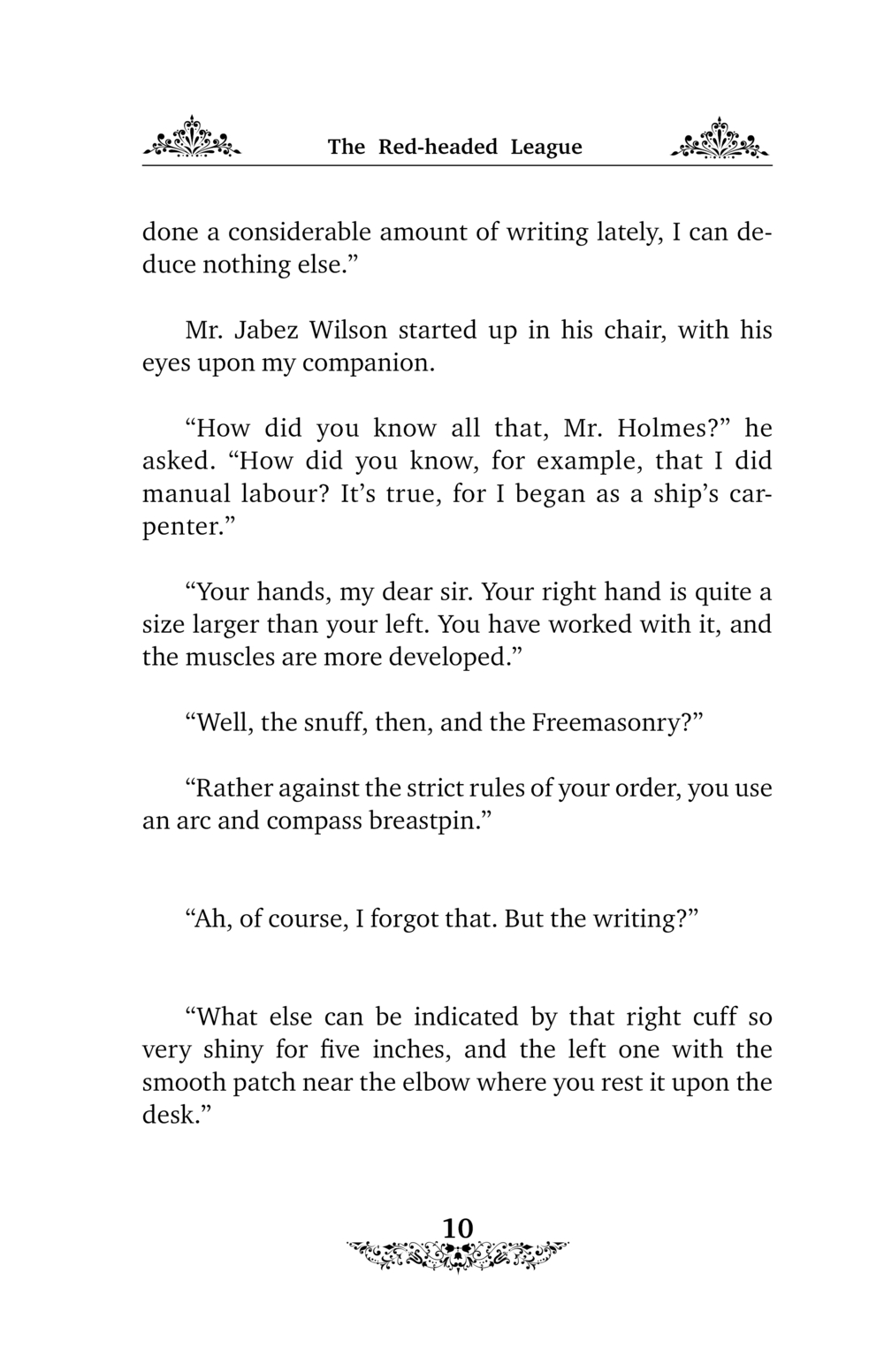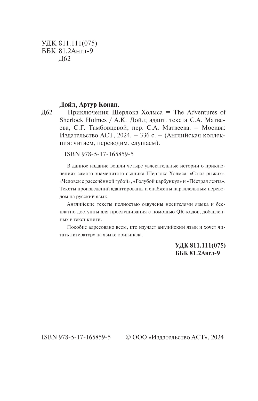 В данное издание вошли четыре увлекательные истории о приключениях самого знаменитого сыщика Шерлока Холмса: "Союз рыжих", "Человек с рассечённой губой", "Голубой карбункул" и "Пёстрая лента". Тексты произведений адаптированы и снабжены параллельным переводом на русский язык.
