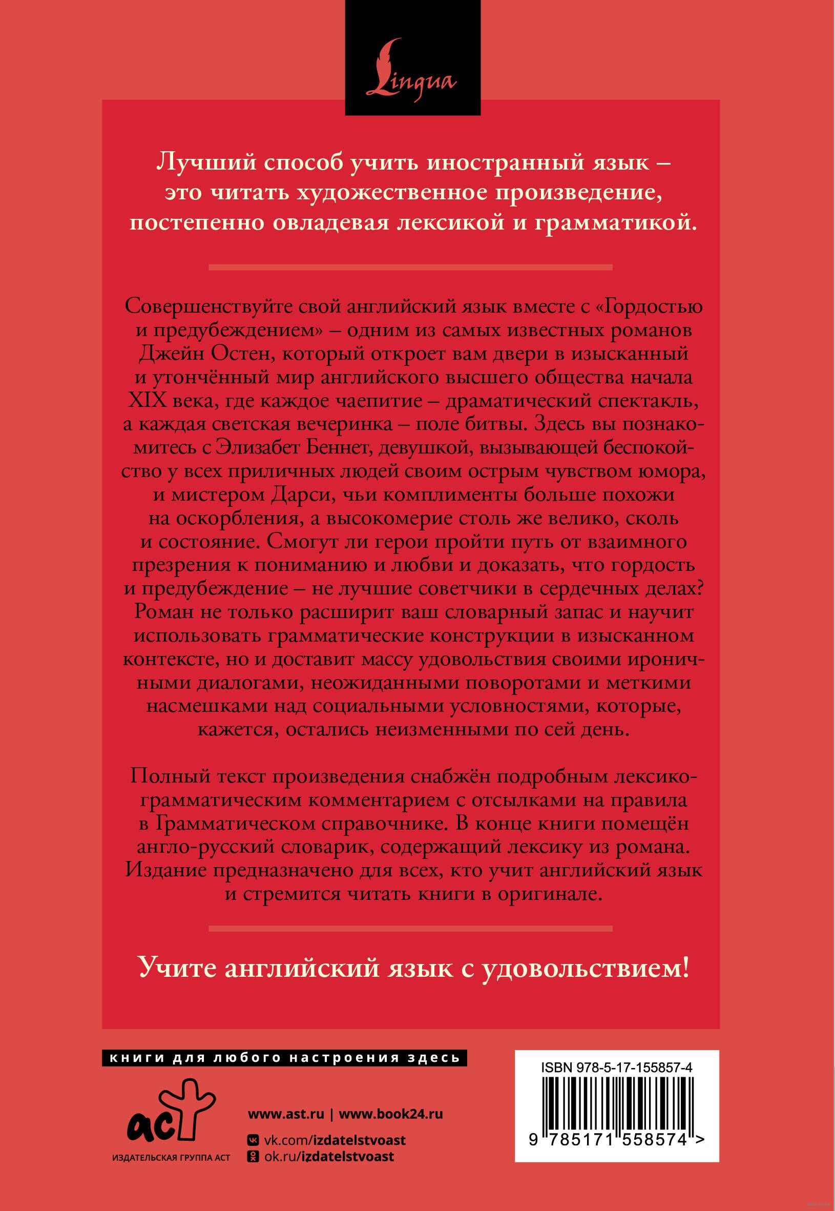 Совершенствуйте свой английский язык вместе с "Гордостью и предубеждением" – одним из самых известных романов Джейн Остен, который откроет вам двери в изысканный и утончённый мир английского высшего общества начала XIX века, где каждое чаепитие – драматический спектакль, а каждая светская вечеринка – поле битвы. Здесь вы познакомитесь с Элизабет Беннет, девушкой, вызывающей беспокойство у всех приличных людей своим острым чувством юмора, и мистером Дарси, чьи комплименты больше похожи на оскорбления, а высокомерие столь же велико, сколь и состояние. Смогут ли герои пройти путь от взаимного презрения к пониманию и любви и доказать, что гордость и предубеждение – не лучшие советчики в сердечных делах?