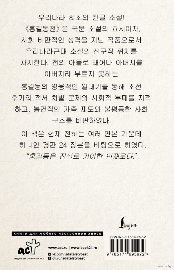 "Сказание о Хон Гильдоне", также известное как "Повесть о Хон Гильдоне" – это не просто первый роман, написанный на корейском языке, а великое остросоциальное произведение, которое стало предвестником корейской художественной прозы нового времени – прозы, обращённой к народу. Через историю Хон Гильдона – юноши, рождённого от наложницы и не имеющего права называть своего отца "отцом", – автор обнажает язвы позднечосонского общества: классовое неравенство, разложение власти, лицемерие феодального семейного уклада.