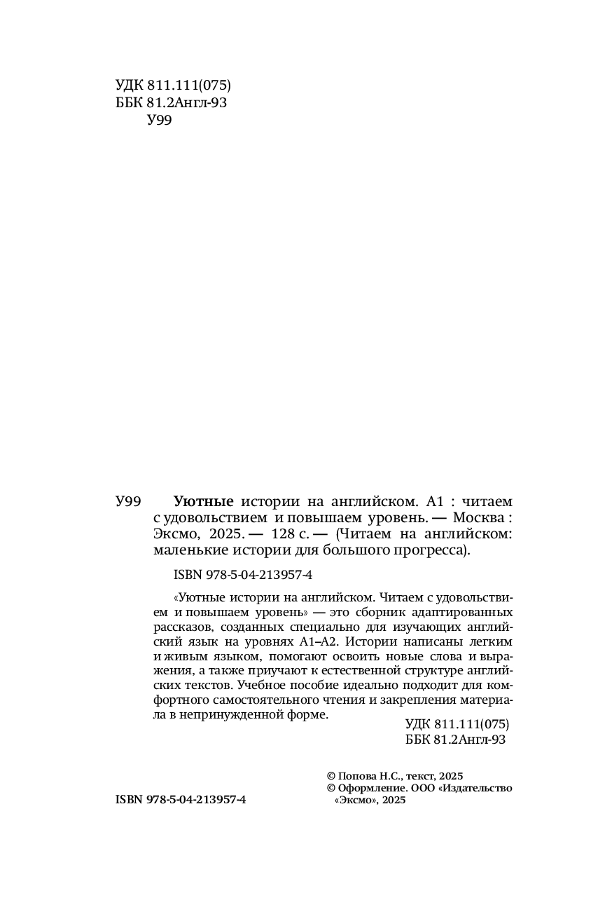 "Читаем с удовольствием. Уютные истории на английском" – это сборник из 25 коротких рассказов уровня A1, написанных живым и бережным языком. Эти тексты помогают не только учить английский, но и чувствовать в нём тепло и вдохновение.