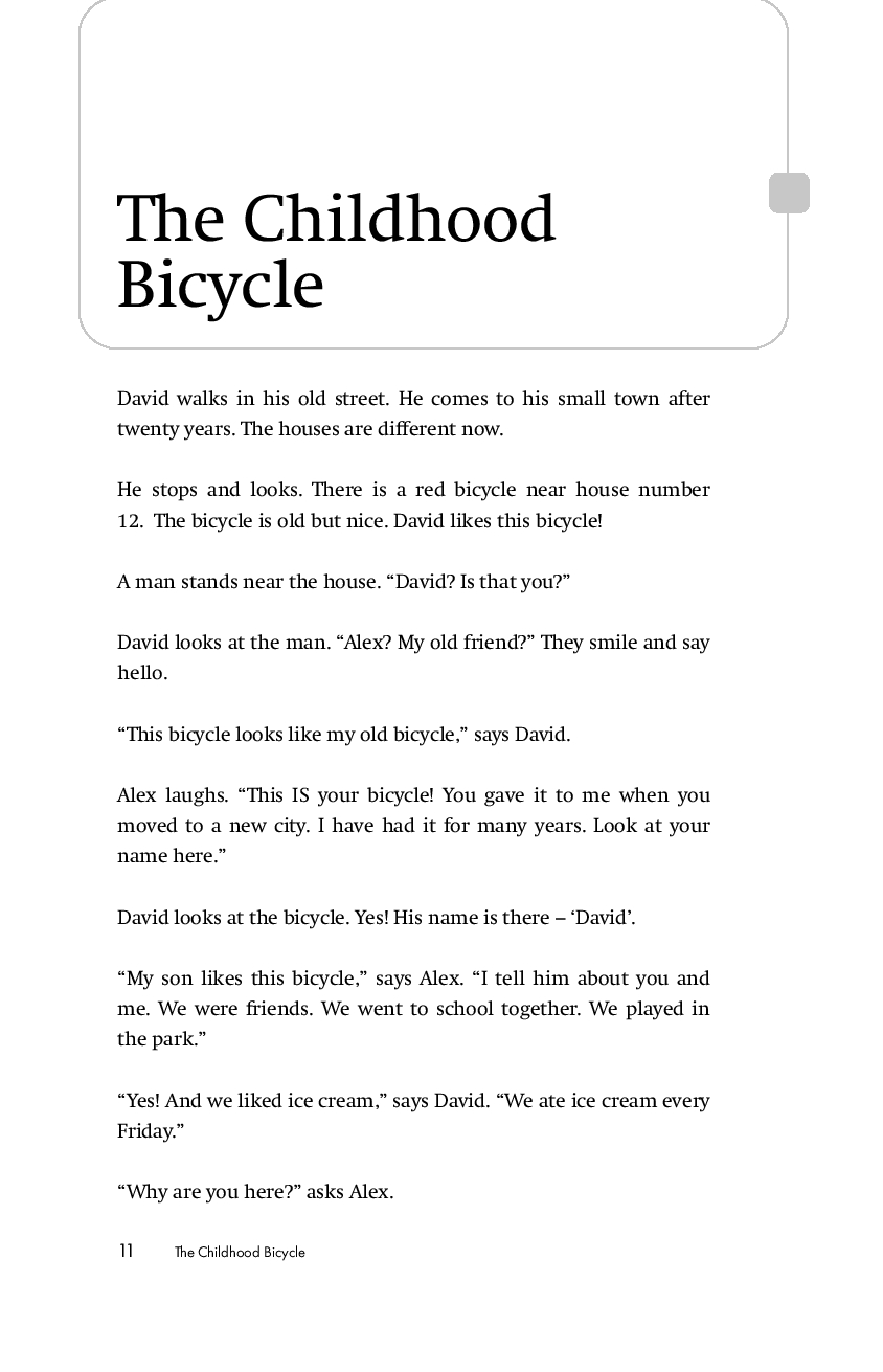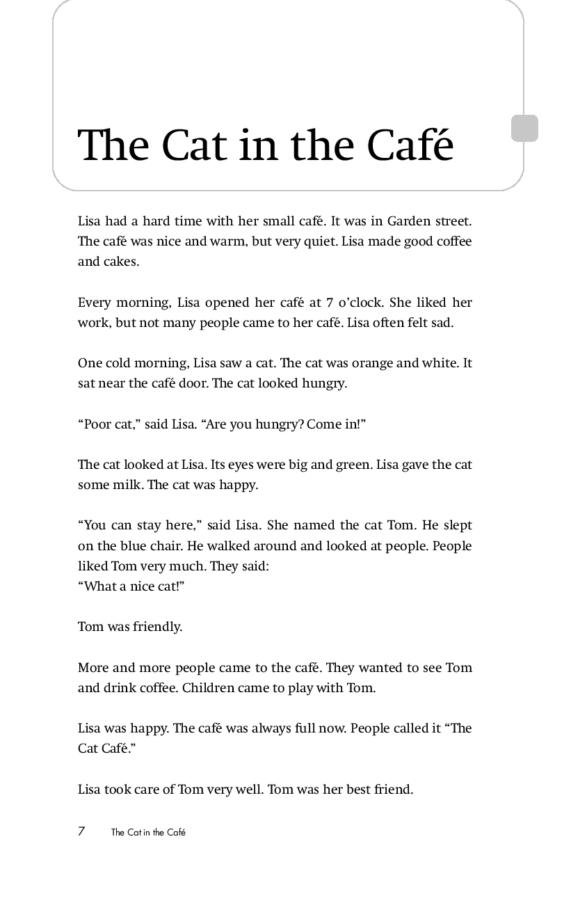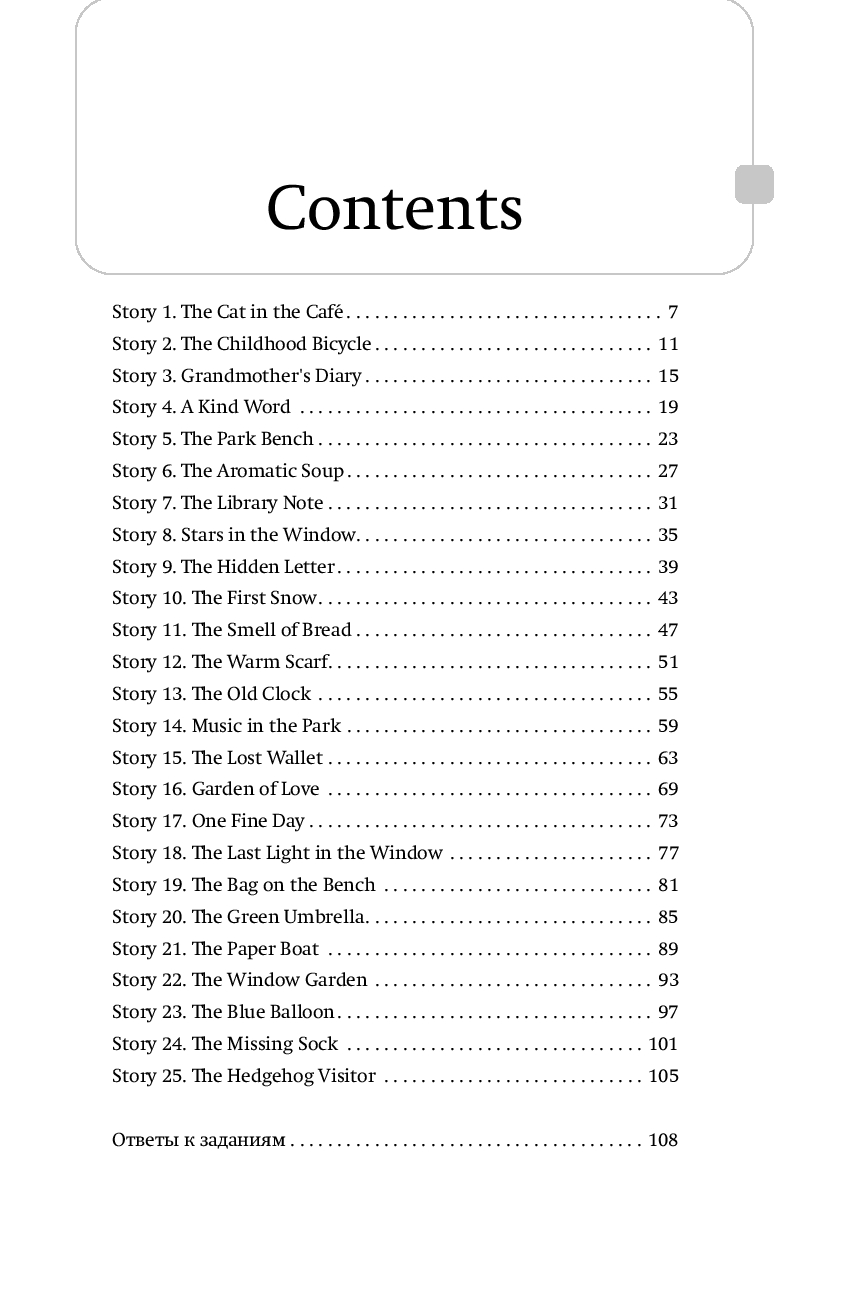 Каждая история – это небольшая повседневная сцена: о кошке в кафе, о письме из прошлого, о первой снежинке, тёплом шарфе, случайной встрече или прогулке в осеннем парке. Благодаря понятной лексике и естественным выражениям, читать легко и приятно.