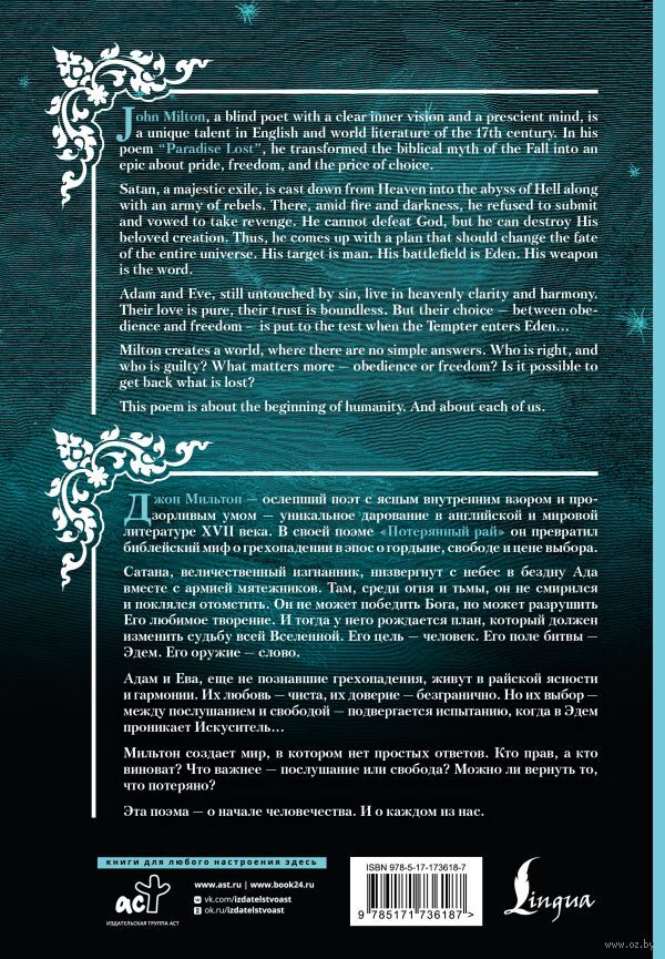 Джон Мильтон – ослепший поэт с ясным внутренним взором и прозорливым умом – уникальное дарование в английской и мировой литературе XVII века. В своей поэме "Потерянный рай" он превратил библейский миф о грехопадении в эпос о гордыне, свободе и цене выбора.