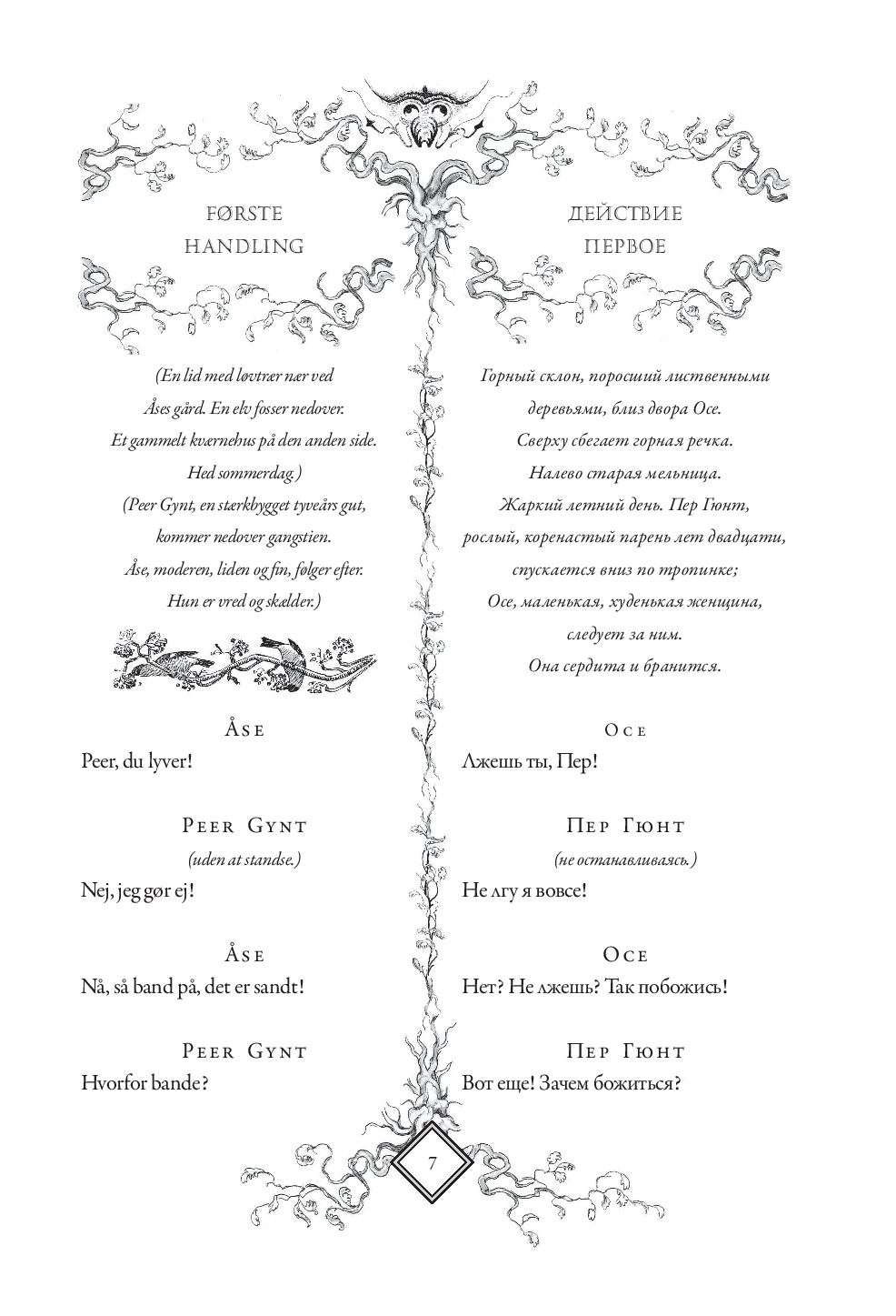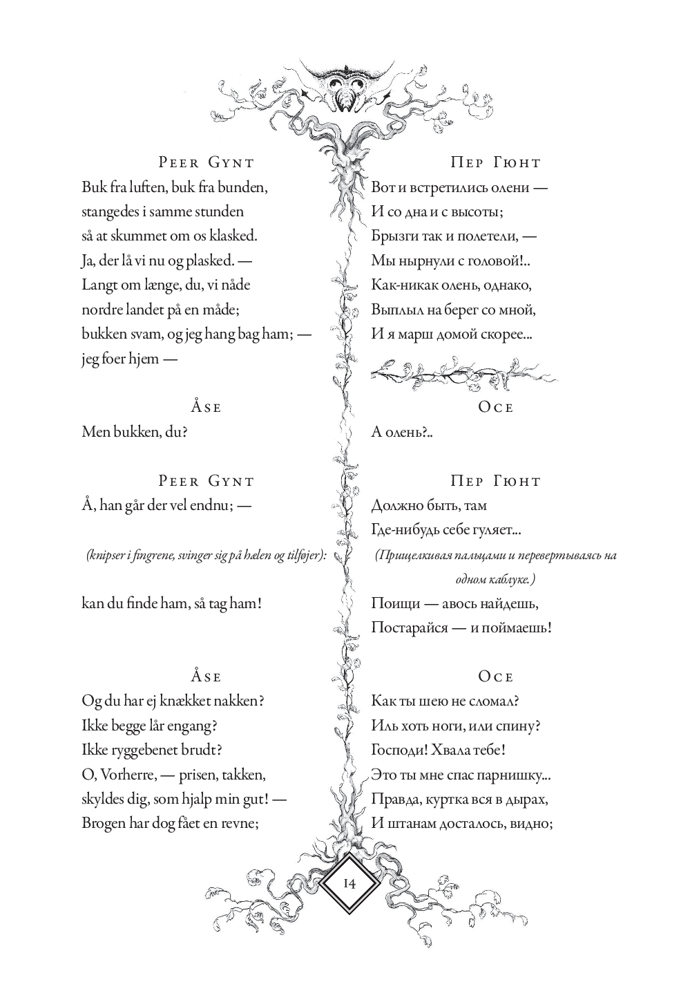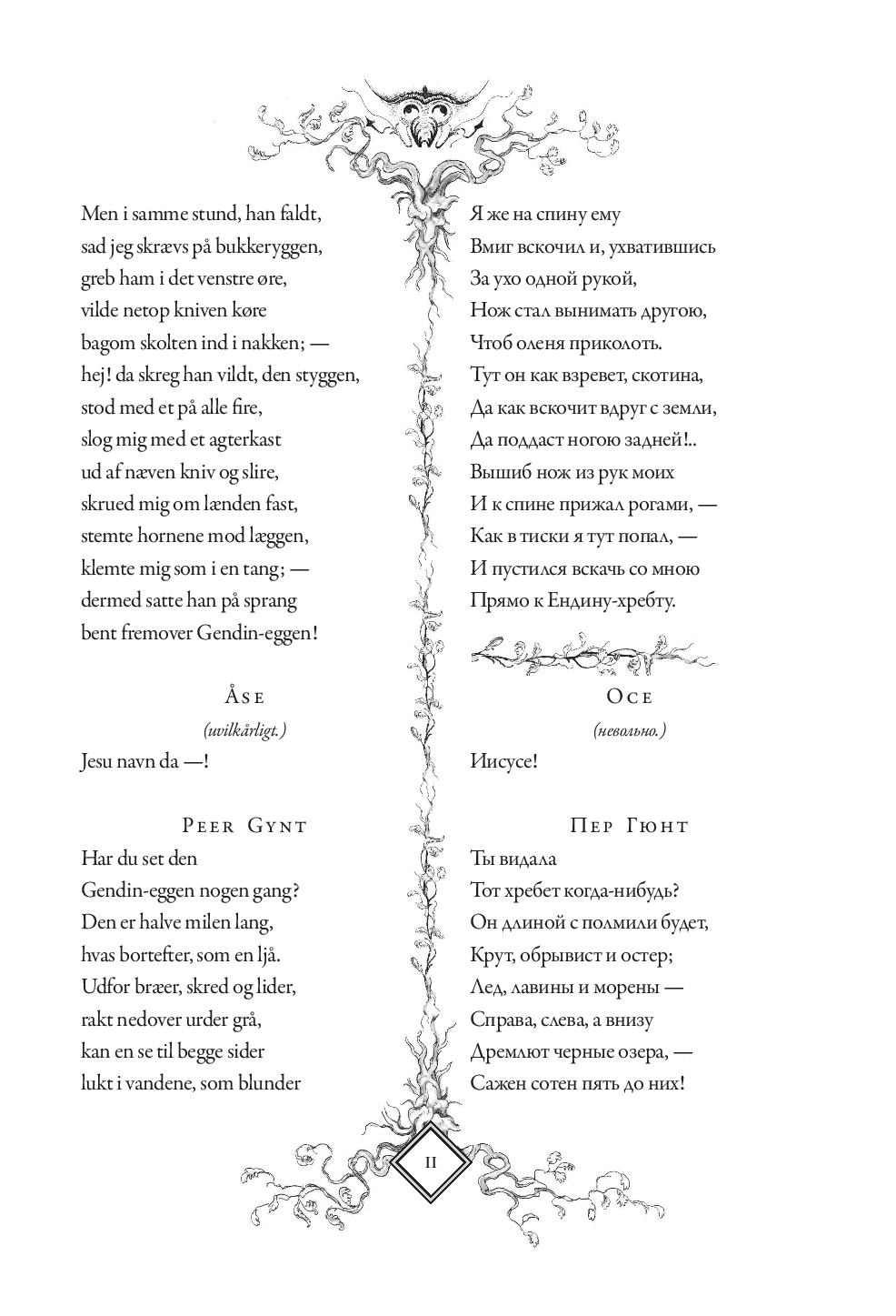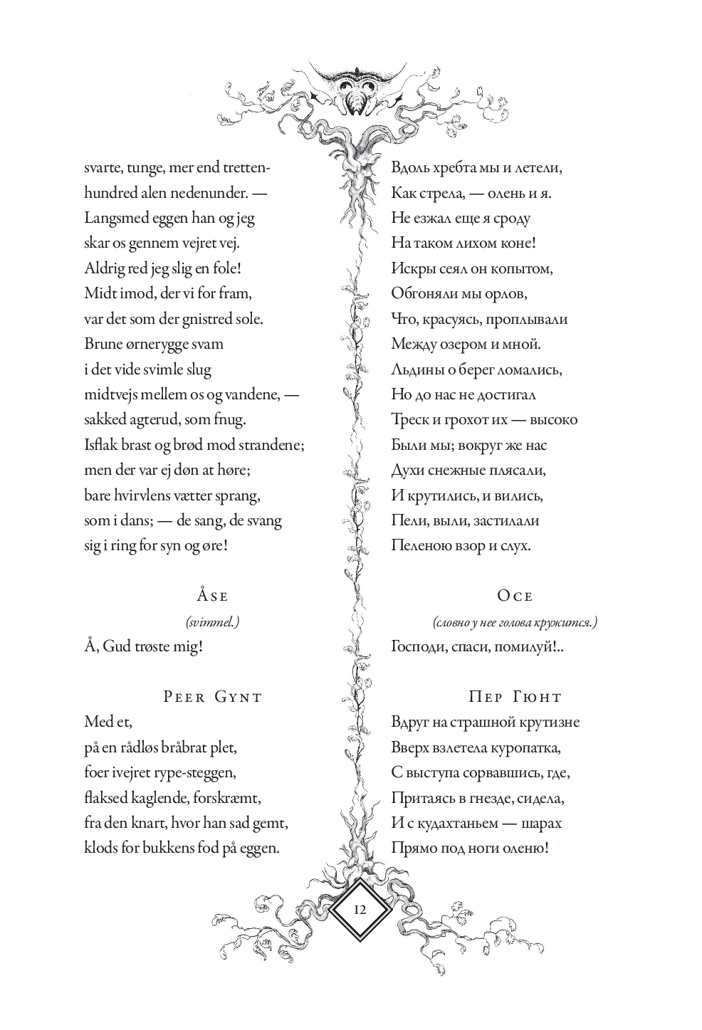 В настоящем издании оригинальный текст "Пер Гюнта" приводится с параллельным переводом Анны и Петра Ганзенов. Для удобства чтения каждая строфа на русском языке расположена напротив соответствующей строфы на норвежском. Такое расположение позволит без труда сравнивать текст оригинала с переводом, обращать внимание на трудности, с которыми сталкивались переводчики, и отмечать наиболее точно переведенные фрагменты.