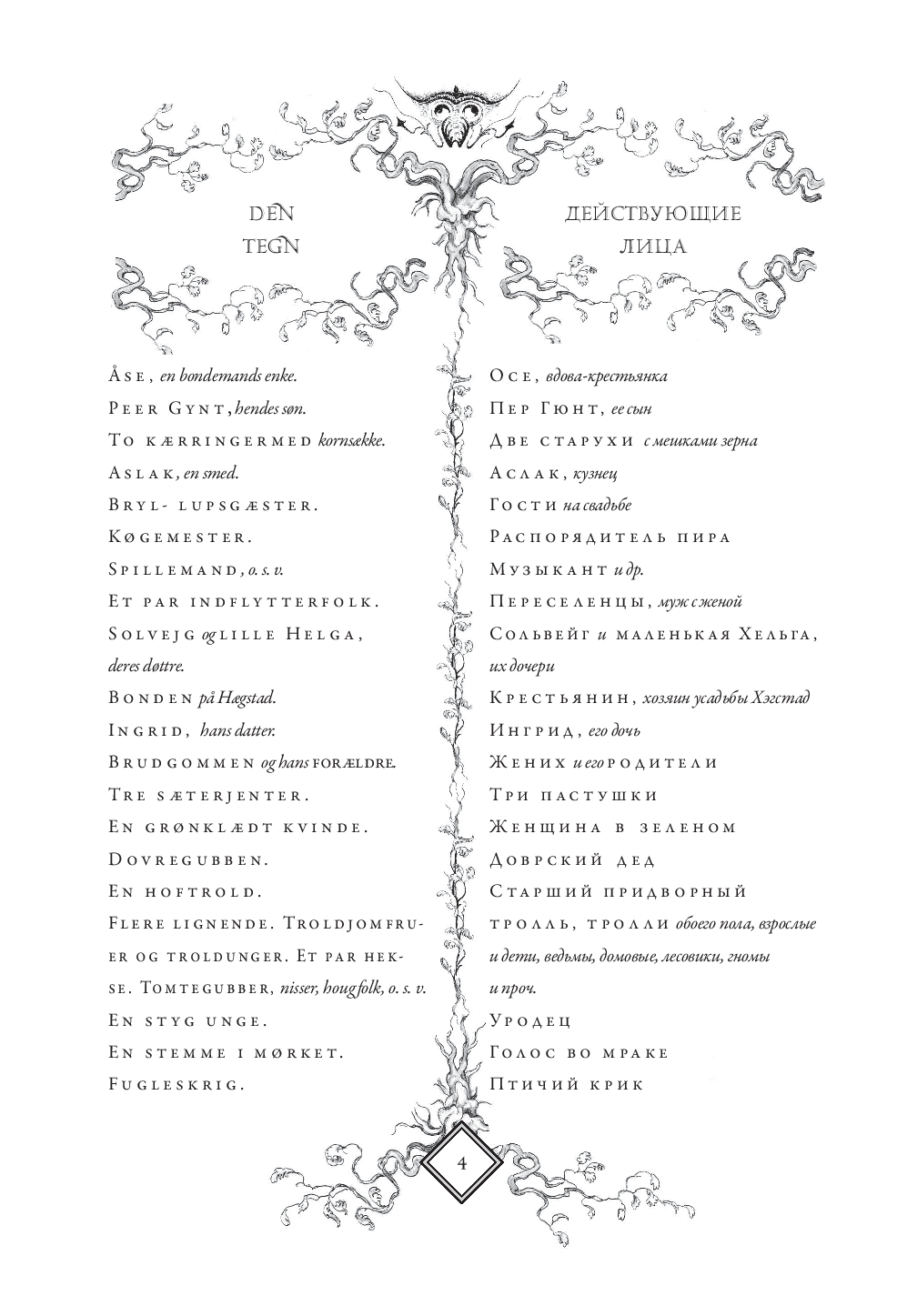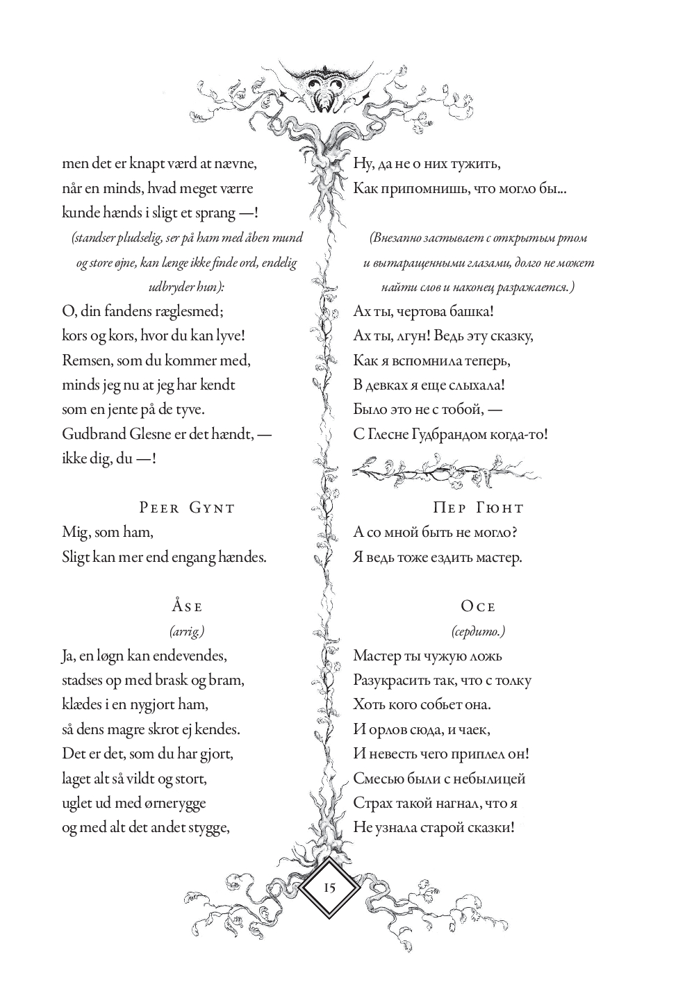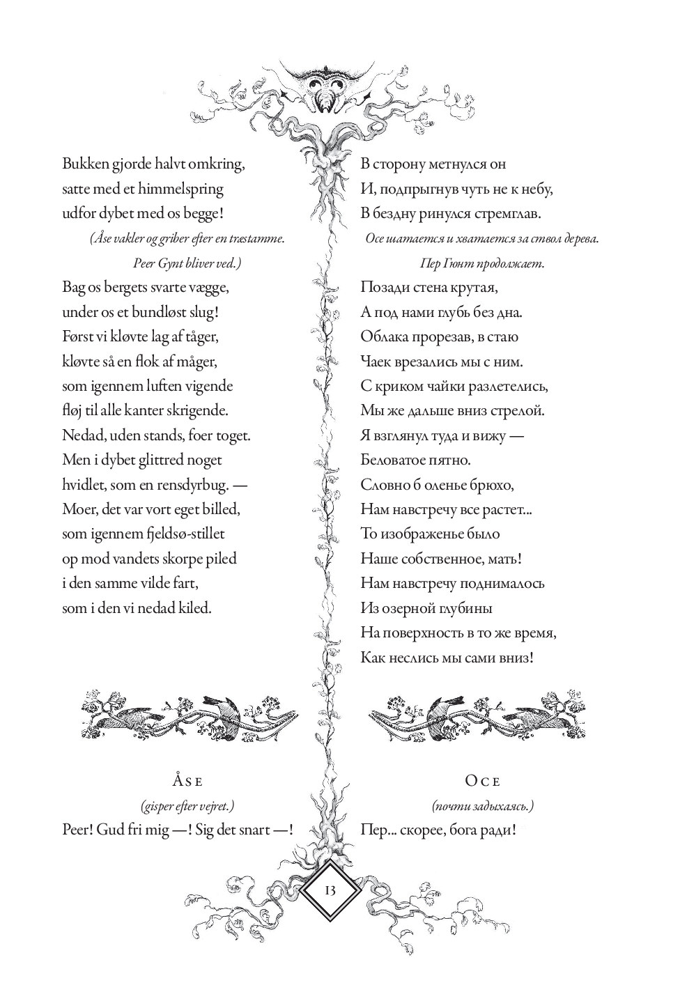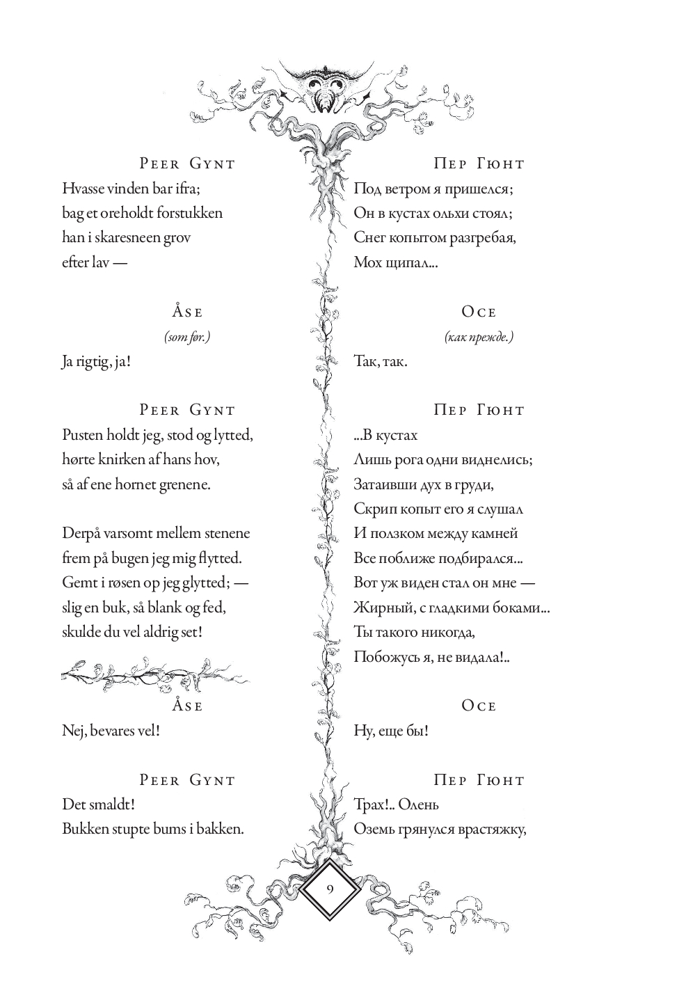 В настоящем издании оригинальный текст "Пер Гюнта" приводится с параллельным переводом Анны и Петра Ганзенов. Для удобства чтения каждая строфа на русском языке расположена напротив соответствующей строфы на норвежском. Такое расположение позволит без труда сравнивать текст оригинала с переводом, обращать внимание на трудности, с которыми сталкивались переводчики, и отмечать наиболее точно переведенные фрагменты.