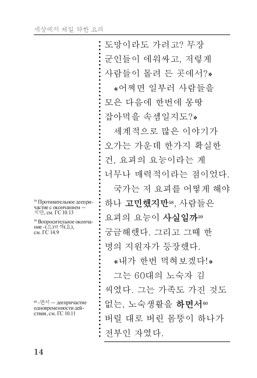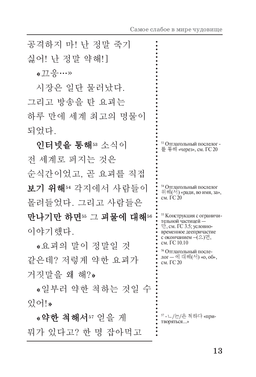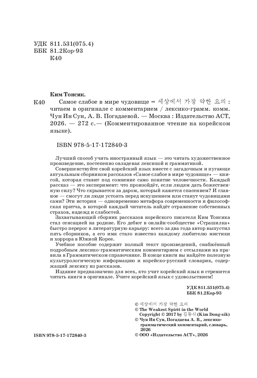 Совершенствуйте свой корейский язык вместе с загадочным и пугающе актуальным сборником рассказов "Самое слабое в мире чудовище" – книгой, которая ставит под сомнение само понятие человечности. Каждый рассказ – это эксперимент: что произойдёт, если людям дать божественную силу? Что скрывается за даром, который кажется спасением? И главное – смогут ли люди устоять перед искушением или станут чудовищами сами? Эти истории – одновременно метафора современности и философская притча, в которой каждый читатель найдёт отражение собственных страхов, надежд и слабостей.