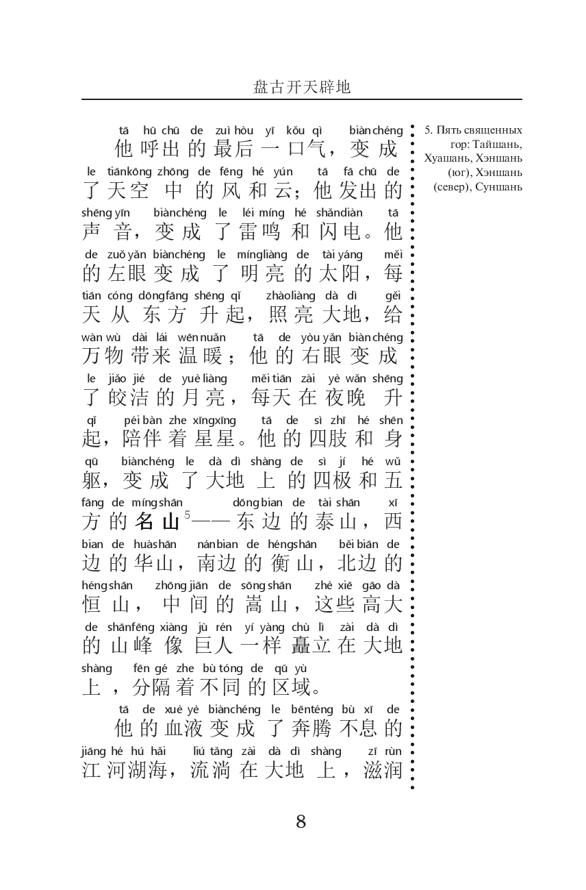Эта книга включает в себя такие известные древние китайские легенды, как легенда о Паньгу, о Нюйве, о Суй Жэне, о Хуан-ди, предания о возникновении китайских праздников и многие другие.