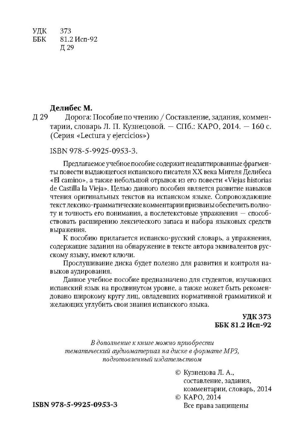 Предлагаемое учебное пособие содержит неадаптированные фрагменты повести выдающегося испанского писателя XX века Мигеля Делибеса "El camino", а также небольшой отрывок из его повести "Viejas historias de Castilla la Vieja". Целью данного пособия является развитие навыков чтения оригинальных текстов на испанском языке. Сопровождающие текст лексико-грамматические комментарии призваны обеспечить полноту и точность его понимания, а послетекстовые упражнения – способствовать расширению лексического запаса и набора языковых средств выражения.