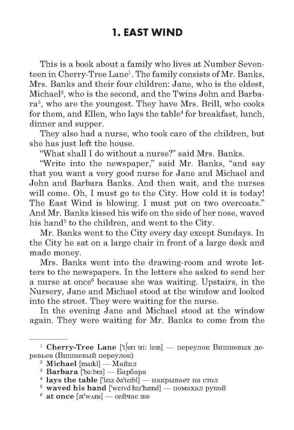 Автор-составитель Ю.Б.Голицынский подготовил для учеников средней школы пособие по чтению на основе популярной книги о Мэри Поппинс писательницы П.Л.Трэверс. Видеть необычное в привычных вещах и не бояться любых перемен – вот те главные умения, которым учила Мэри Поппинс своих воспитанников. Образ молодой загадочной дамы – ее внешний облик и решительный характер, взаимоотношения с детьми – наверняка будет интересен школьникам, а упражнения на отработку лексических и грамматических трудностей позволят им закрепить знания, полученные на уроках.