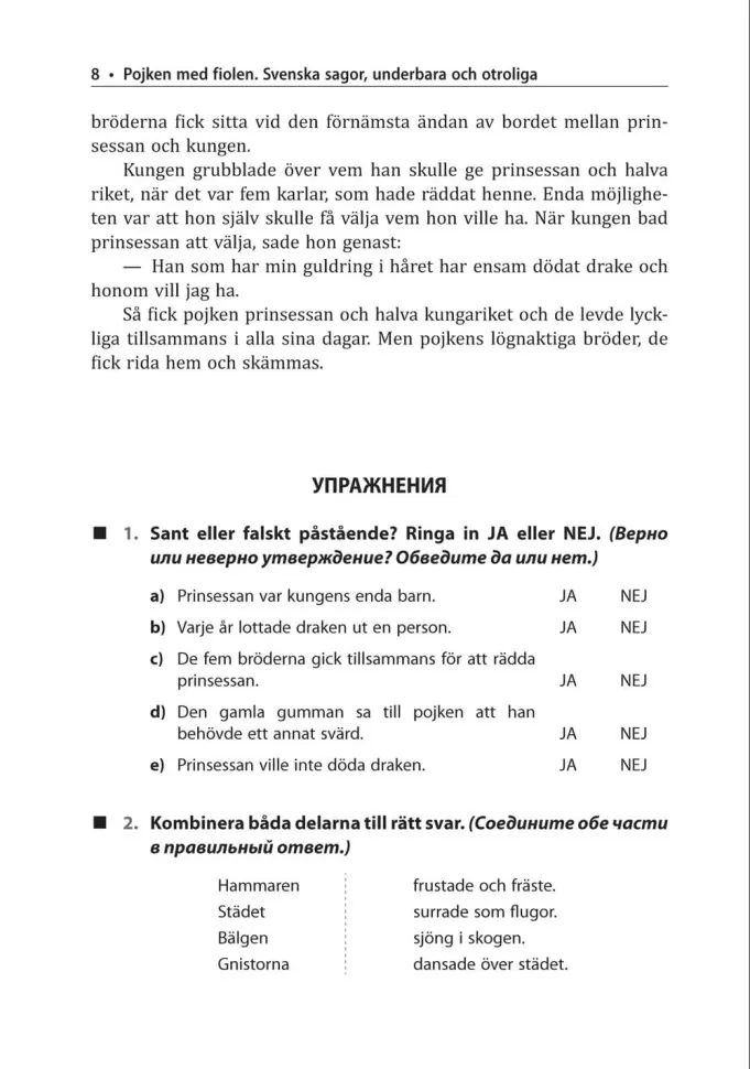 В сборник вошли 5 народных шведских сказок и 5 сказок хорошо известных в России шведских авторов. Сначала читатель окунется в древний мир троллей и чудовищ, чье колдовство оказывается бессильным перед человеческой добротой и преданностью. А затем в очередной раз от души посмеется над проделками любимых персонажей, но на этот раз прочитав фрагменты знакомых произведений в оригинале.