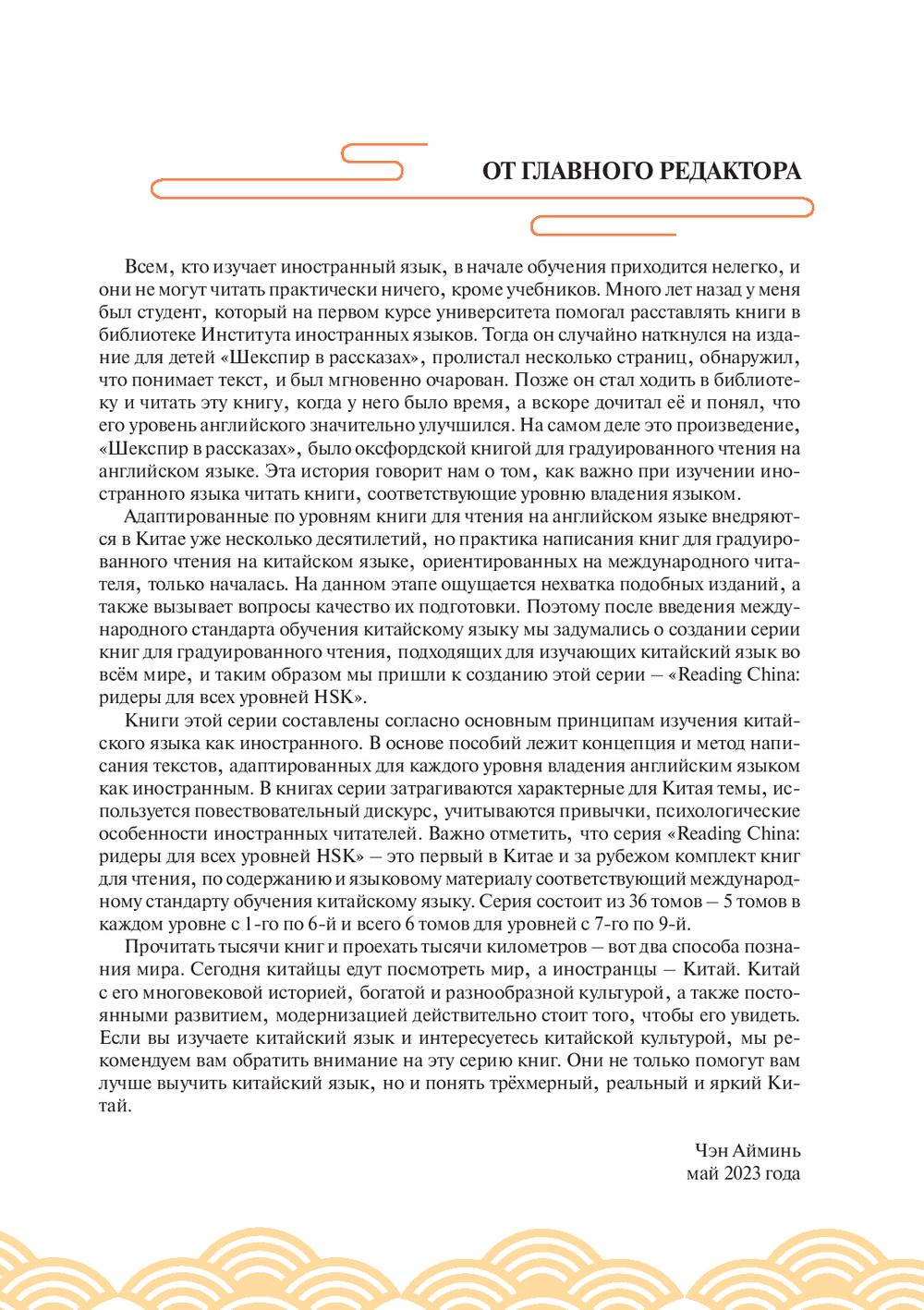 Данное издание – пособие для чтения на китайском языке от CLEC, Центра языкового обмена и сотрудничества Министерства образования КНР. Книга составлена в соответствии с последней версией международного стандарта обучения китайскому языку – прочитав книги третьего уровня, вы сможете улучшить владение китайским языком до средней ступени и подгото-виться к соответствующему экзамену HSK 3.0.