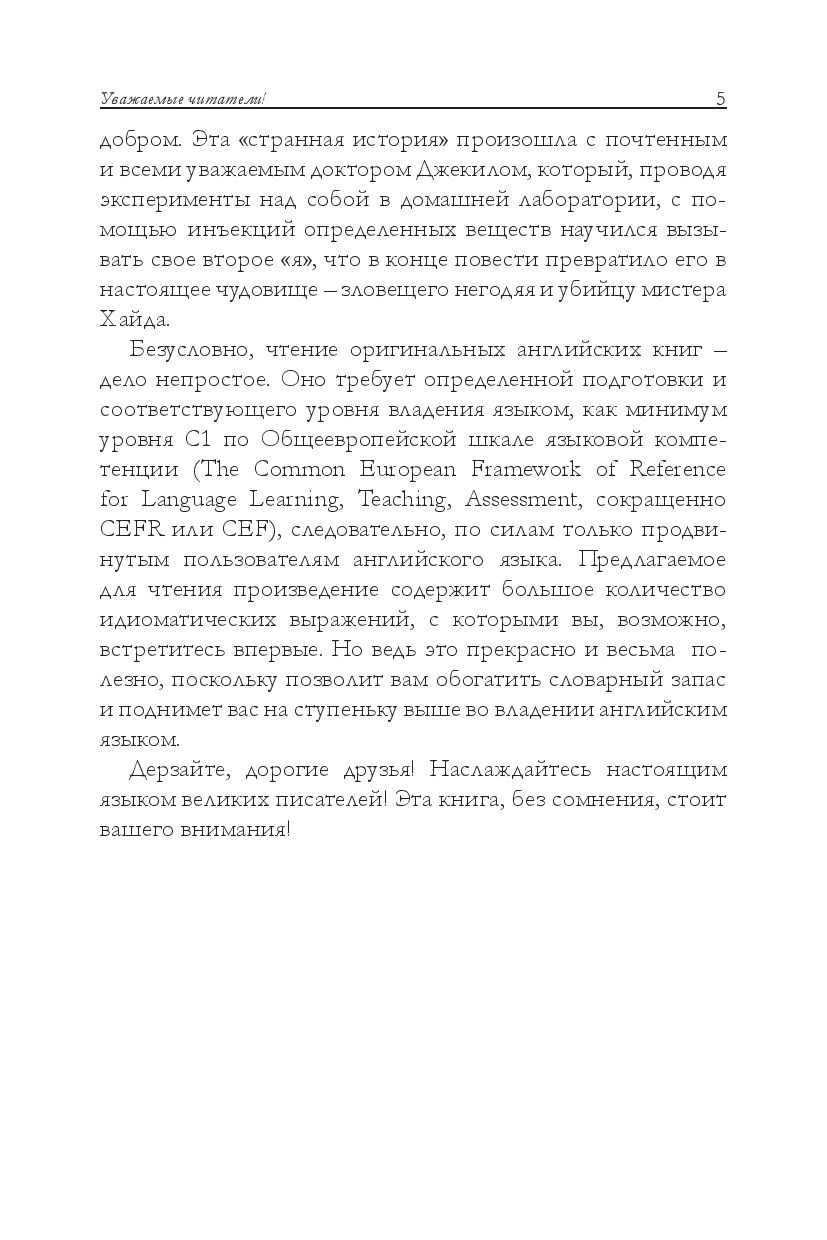 "Доктор Джекил и мистер Хайд" – повесть, написанная в 1886 году шотландским писателем Робертом Льюисом Стивенсоном. Эта книга подготовлена специально для изучающих английский язык. Чтобы облегчить понимание художественных текстов, каждая страница сопровождается переводом отдельных слов и необходимыми комментариями, а в конце книги приводится англо-русский словарь, содержащий большинство употребляемых слов. В отличие от двуязычных изданий она позволяет читателю самому интерпретировать значения слов в зависимости от контекста и, таким образом, не только делает приятным чтение на иностранном языке, но и развивает языковые навыки. Повышайте свой уровень владения английским, читая это замечательное художественное произведение!