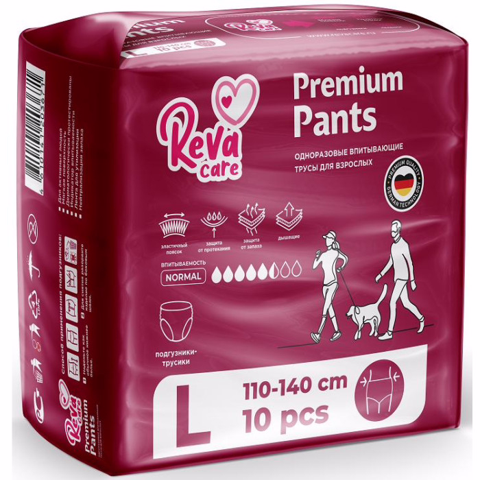 Сухость, идеальное прилегание к телу и комфорт во время движений – главные требования к подгузникам для взрослых. Именно такие характеристики подходят для описания трусиков для взрослых Reva Care. Возможность принимать естественную анатомическую форму, мягкие фиксирующие резинки и разнообразие размеров – в этой серии вы обязательно найдете подгузники – трусики для взрослых со средней или тяжелой степенью недержания.