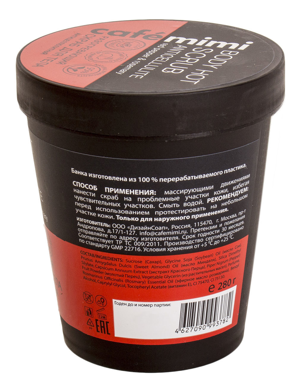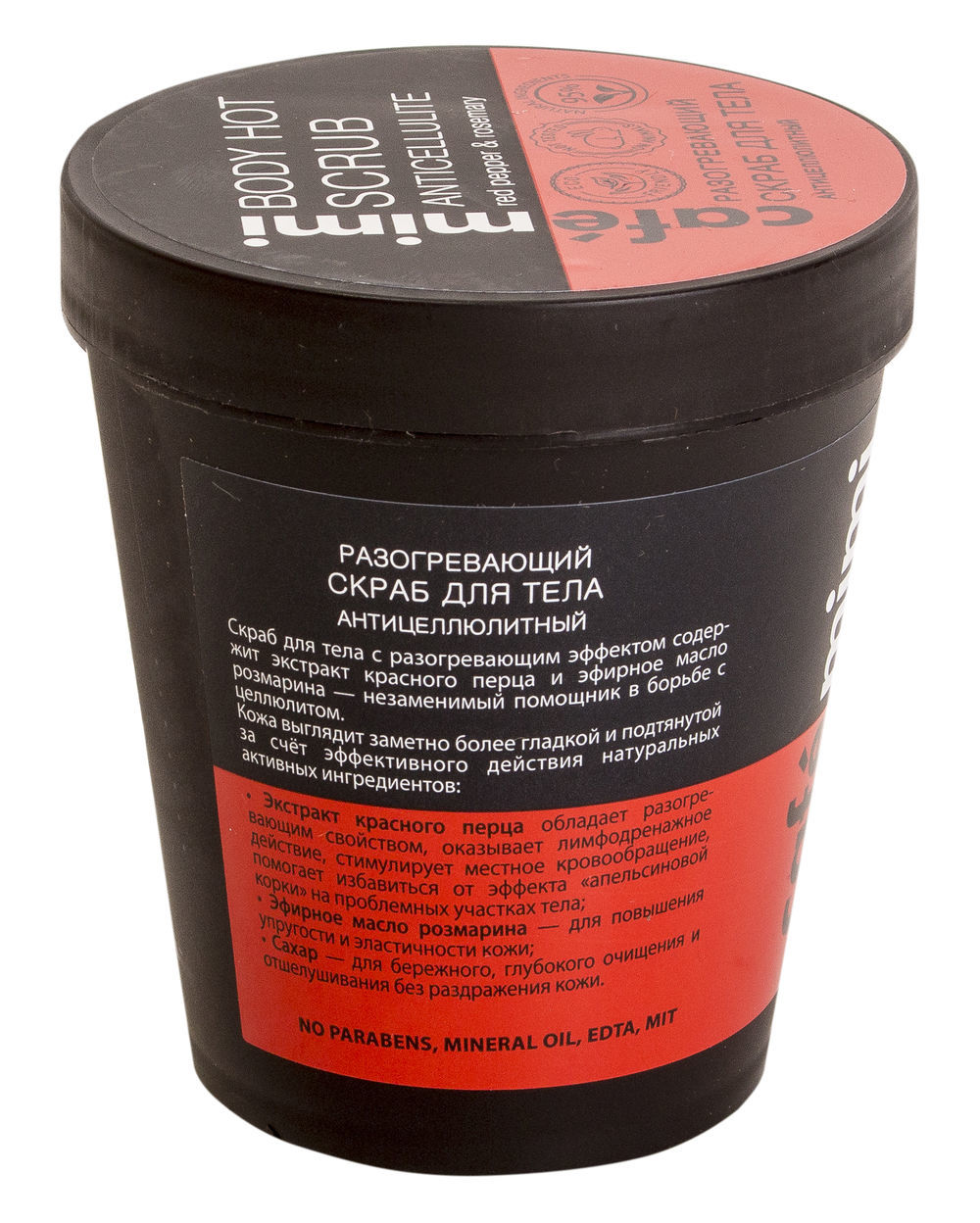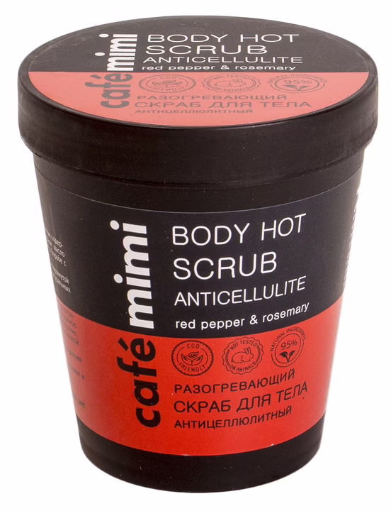 Скраб для тела с разогревающим эффектом содержит экстракт красного перца и эфирное масло розмарина – незаменимый помощник в борьбе с целлюлитом.