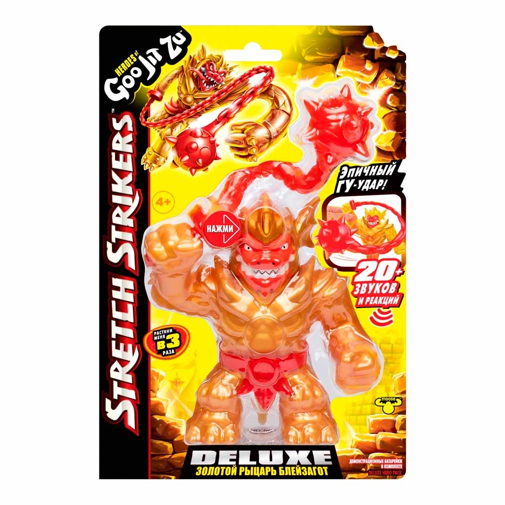 Золотой Рыцарь Блейзагот Делюкс наполнен яркой переливающейся жидкостью. У фигурки есть съемный пояс и растягивающееся оружие. Нажмите на рог на голове фигурки спереди, чтобы активировать звуковые эффекты.