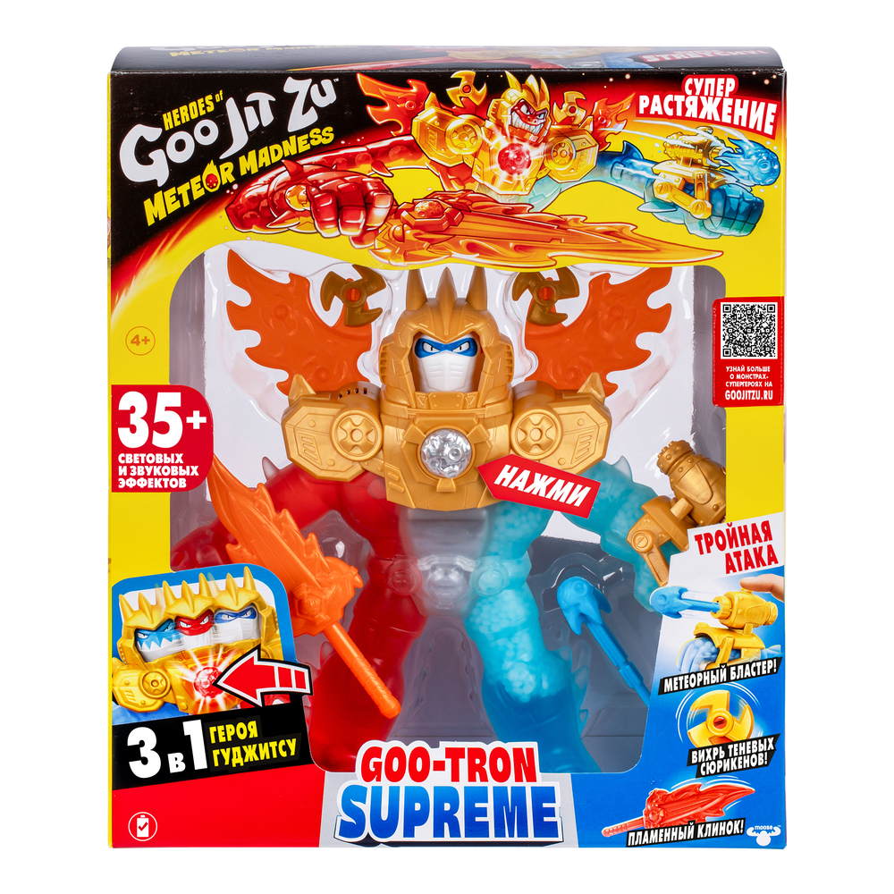 Встречай Непревзойдённого Гу-Трона – самого мощного героя коллекции GooJitZu Метеор Мэднесс! Он объединяет силу трёх легендарных героев: огненного Блейзагота, скрытного Пантаро и неукротимого Траша. Только Гу-Трон способен противостоять разрушительной силе и спасти вселенную Гу от гибели!