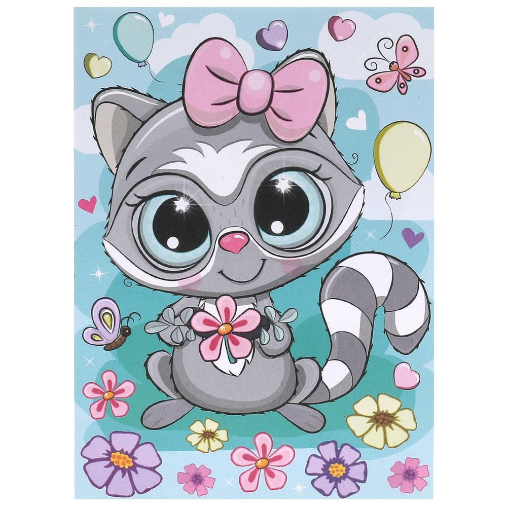С помощью красочной основы и разноцветного блестящего песка маленький художник сможет самостоятельно создать сверкающую аппликацию с изображением милого енота.