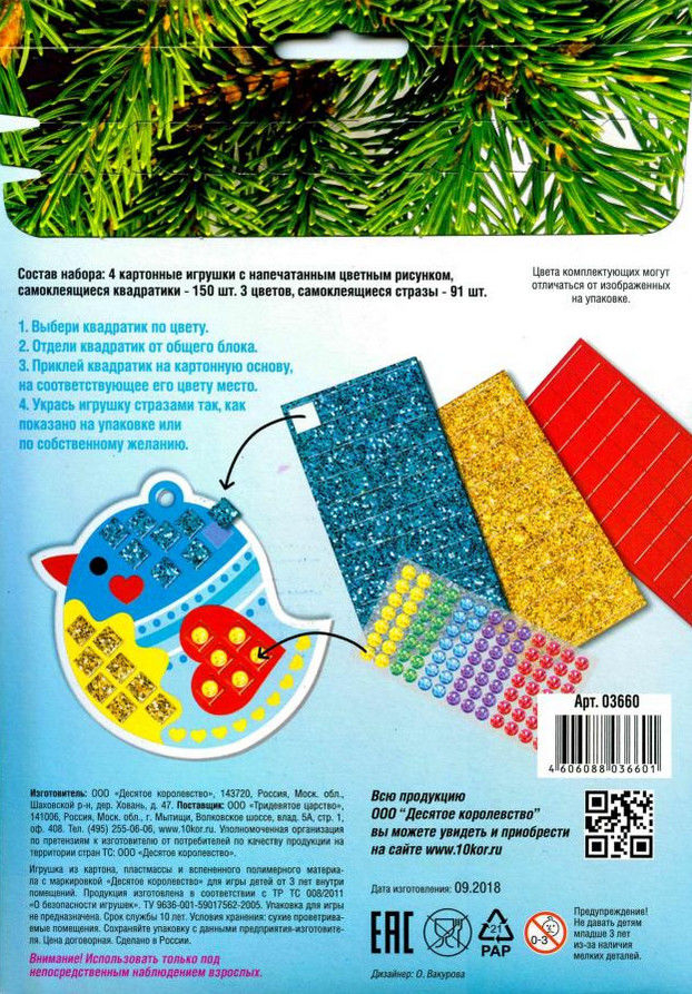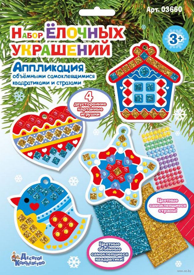 Картина-аппликация "Набор ёлочных украшений!" состоит из четырёх двусторонних цветных картонных игрушек в виде сердечка, птички, звёздочки и домика. Ребёнку необходимо украсить картинки объёмными самоклеящимися квадратиками и стразами.