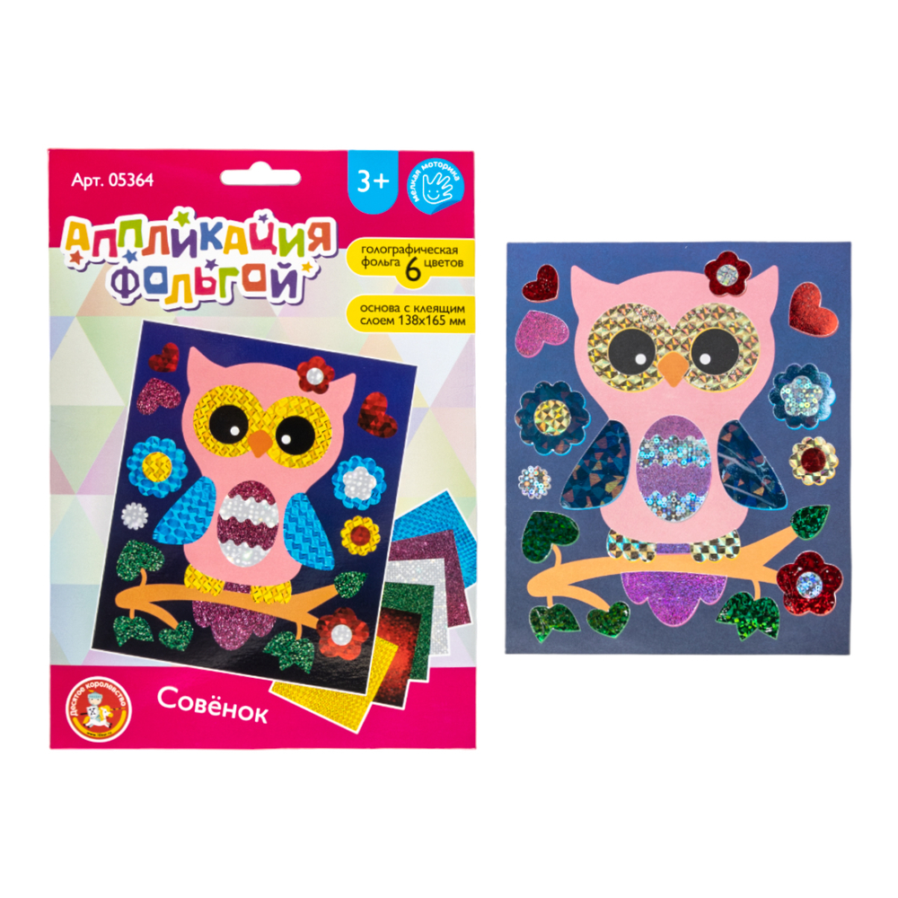 Аппликация из фольги "Совёнок"- новинка среди аппликаций! Она состоит из цветной карточки с изображением и листов цветной фольги. Декорируя картинку фольгой, вы получаете оригинальный шедевр – яркую, цветную открытку, которая может стать замечательным подарком!