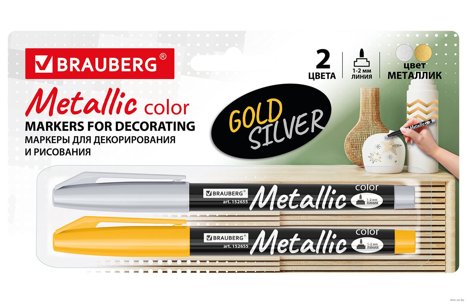 Маркеры для декорирования и рисования золотистого и серебристого цвета "металлик" обладают круглой формой корпуса из пластика, диаметр которого 13 мм. В зависимости от угла наклона наконечника толщина линии письма может быть от 1 до 2 мм.