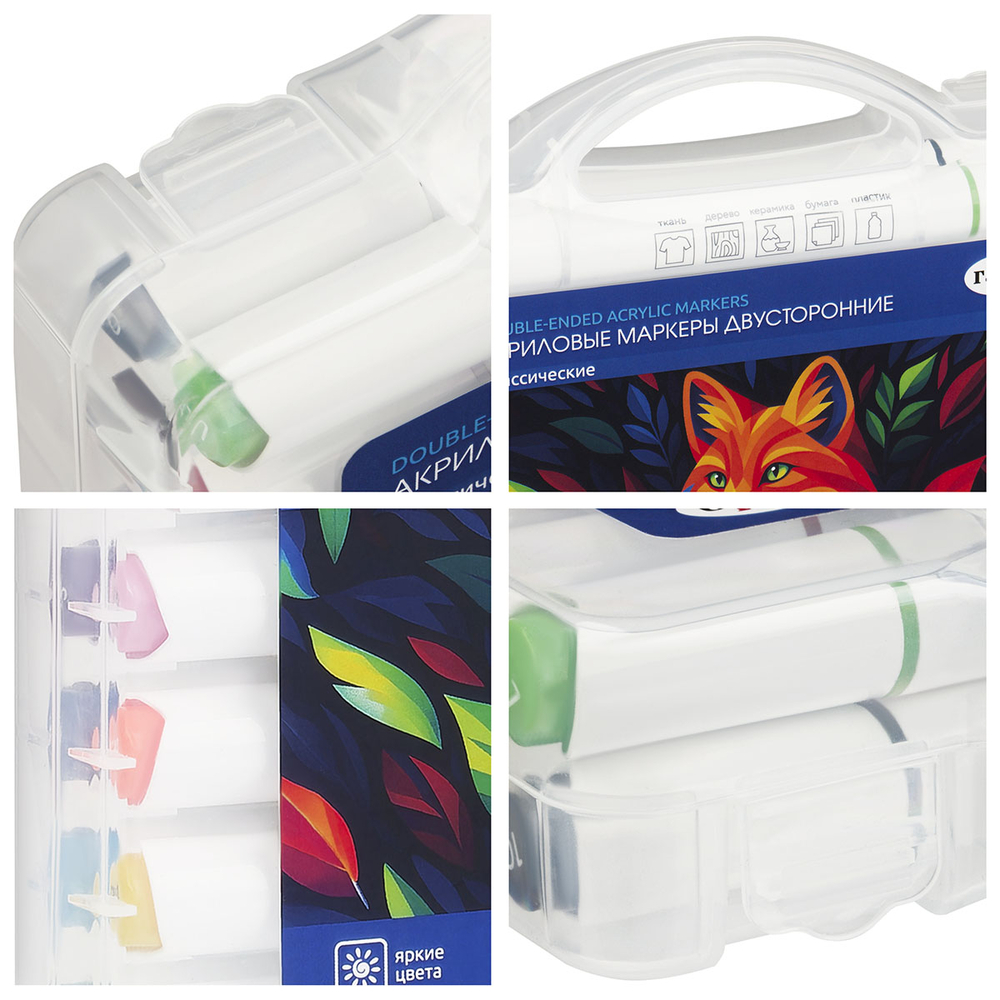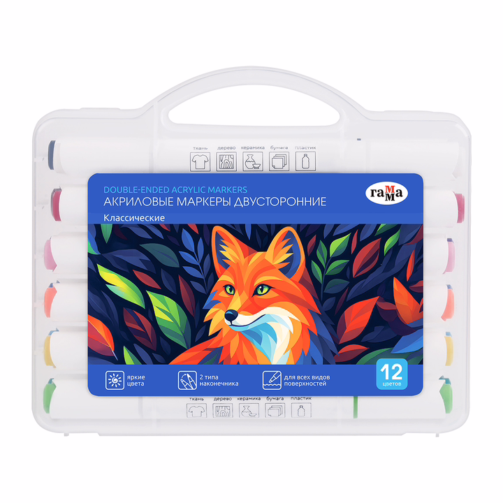 Маркерами можно рисовать на различных поверхностях: бумага, ткань, дерево, камень, пластик, стекло и т.д. Набор в пластиковом кейсе с ручкой и ячейками для каждого маркера.
