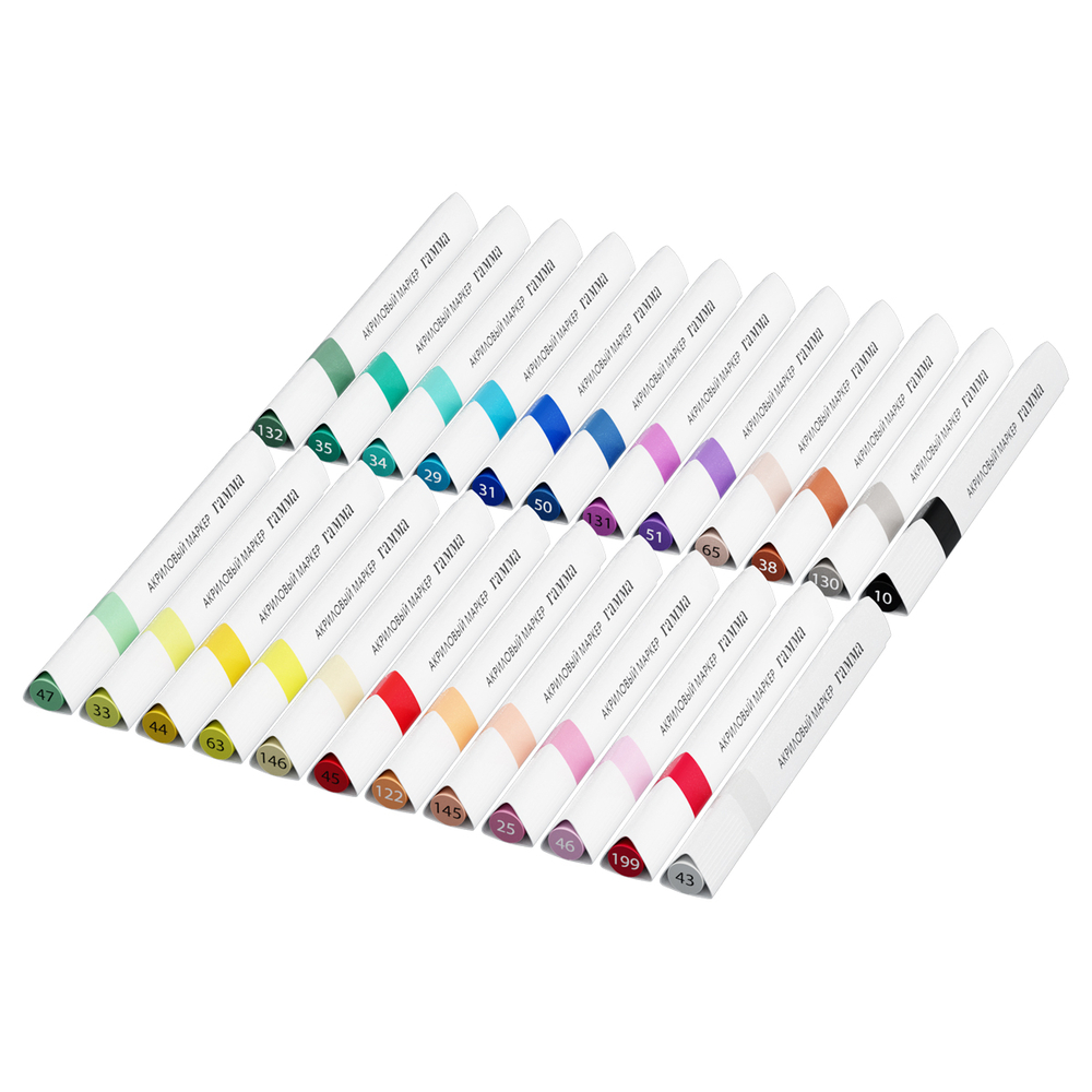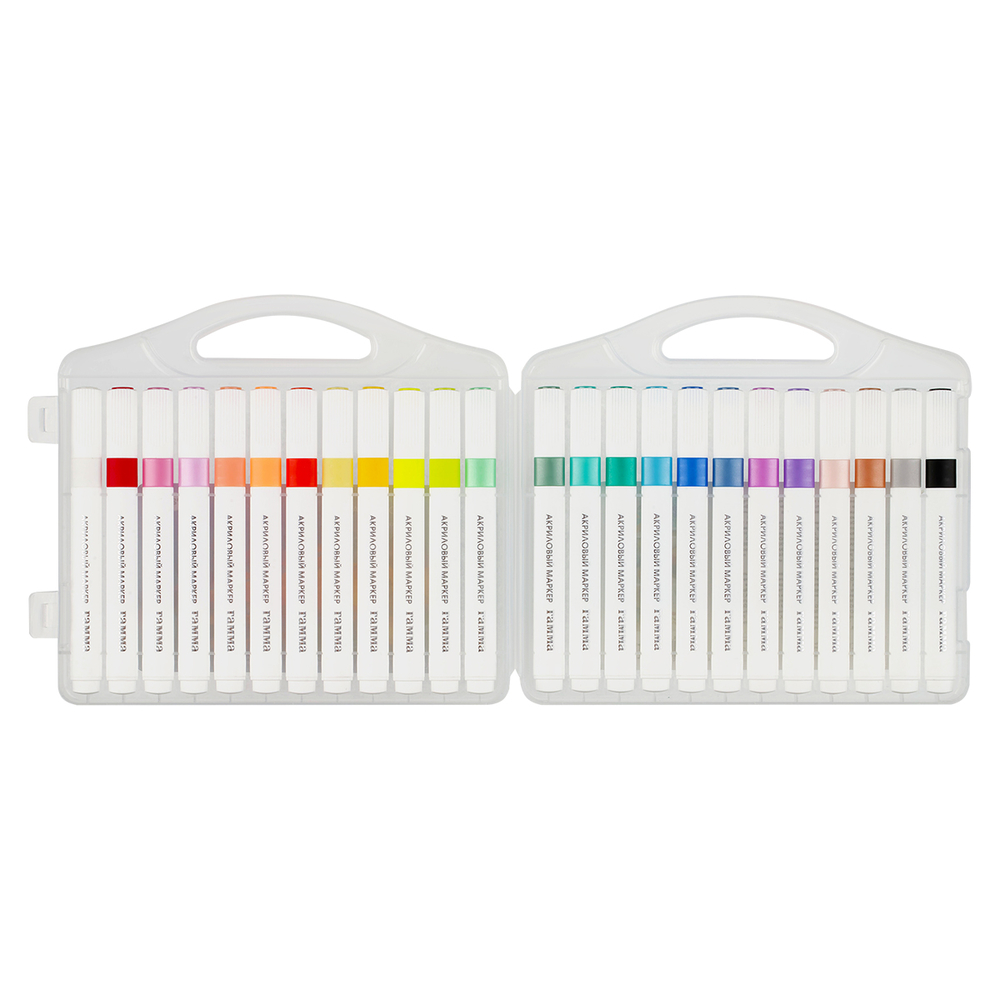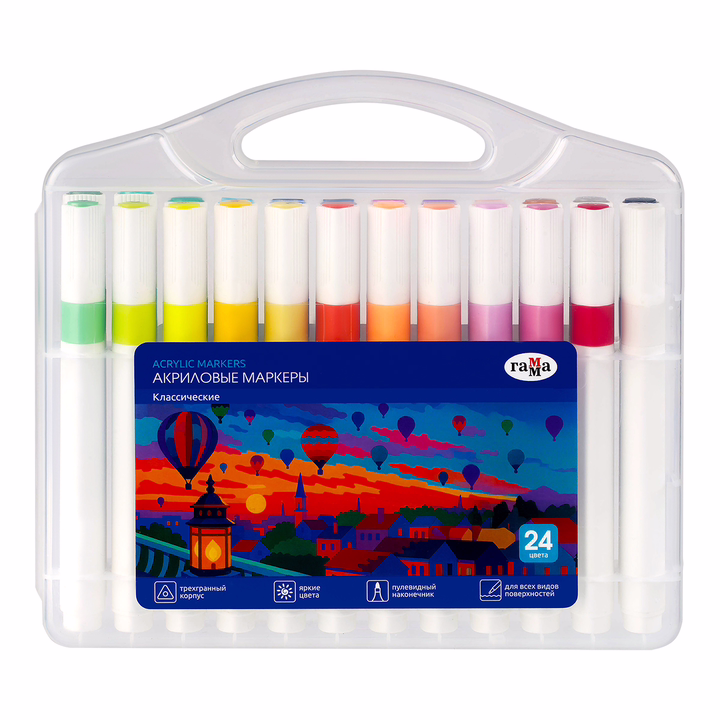 Набор акриловых маркеров Гамма серии "Классическая" для детского творчества и хобби. Набор состоит из 24 укороченных маркеров. Форма корпуса – трехгранная. Износостойкий наконечник из нейлона. На колпачке и корпусе вставка, обозначающая цвет чернил. Нумерация цвета на колпачке.