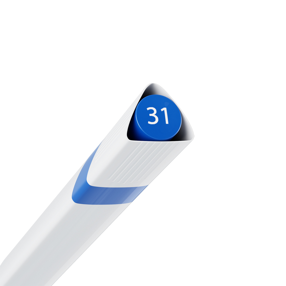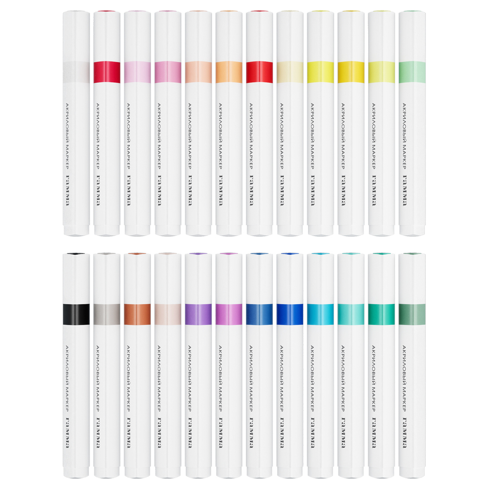 Количество цветов: 24 цвета. Толщина линии – 1-3 мм, форма наконечника – пуля. Высокие укрывные свойства и стойкость после высыхания. Не требуют активации.