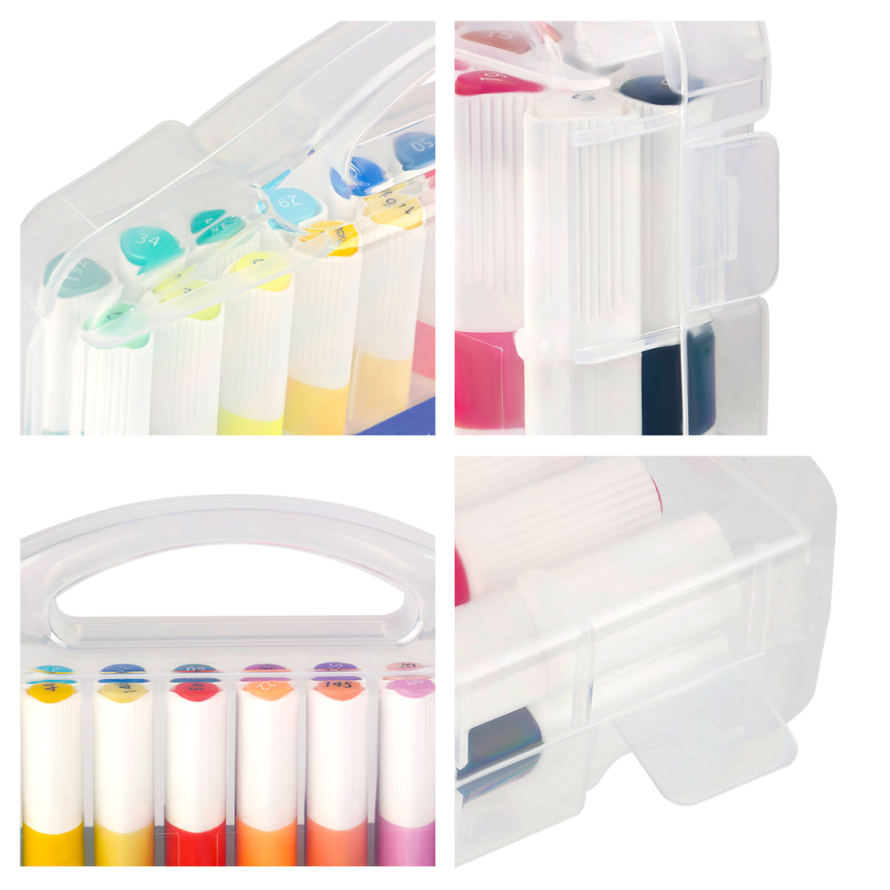 Маркерами можно рисовать на различных поверхностях: бумага, ткань, дерево, камень, пластик, стекло и т.д. Набор в пластиковом кейсе с ручкой и ячейками для каждого маркера.
