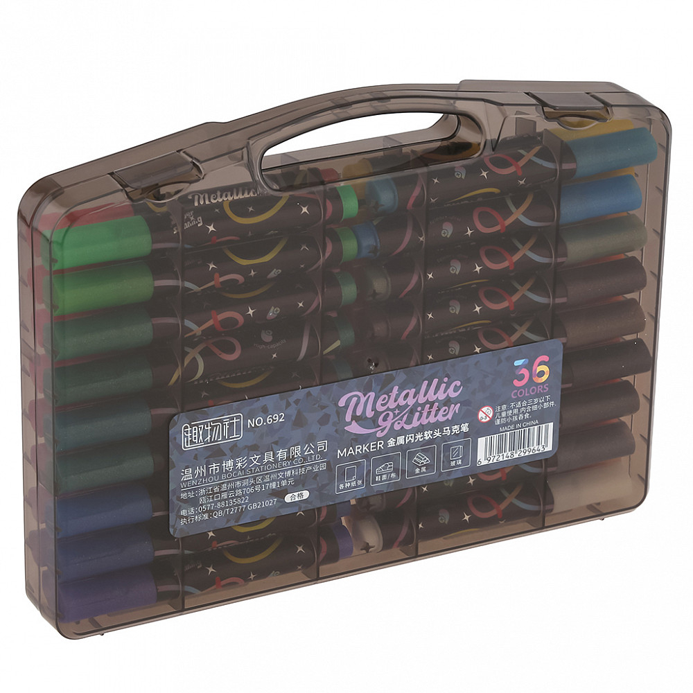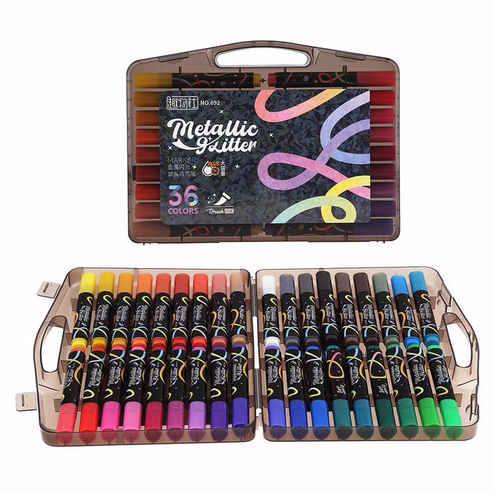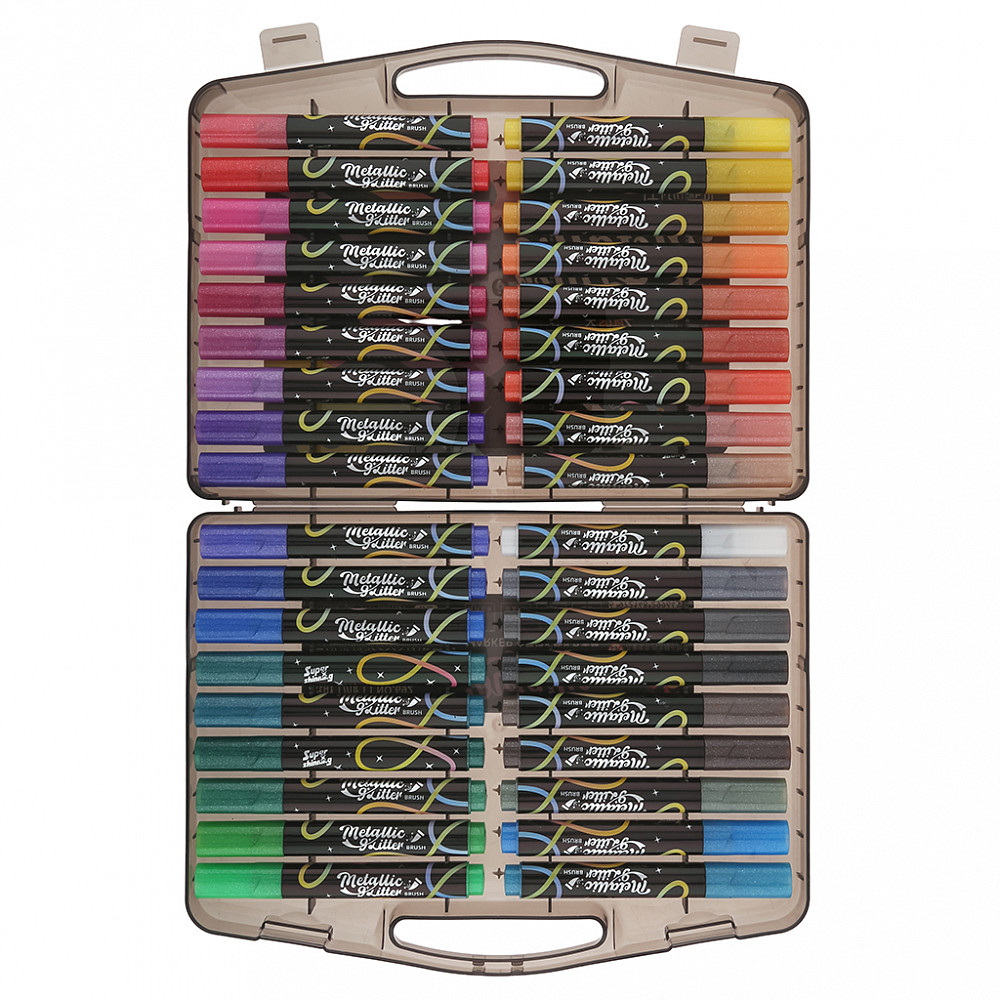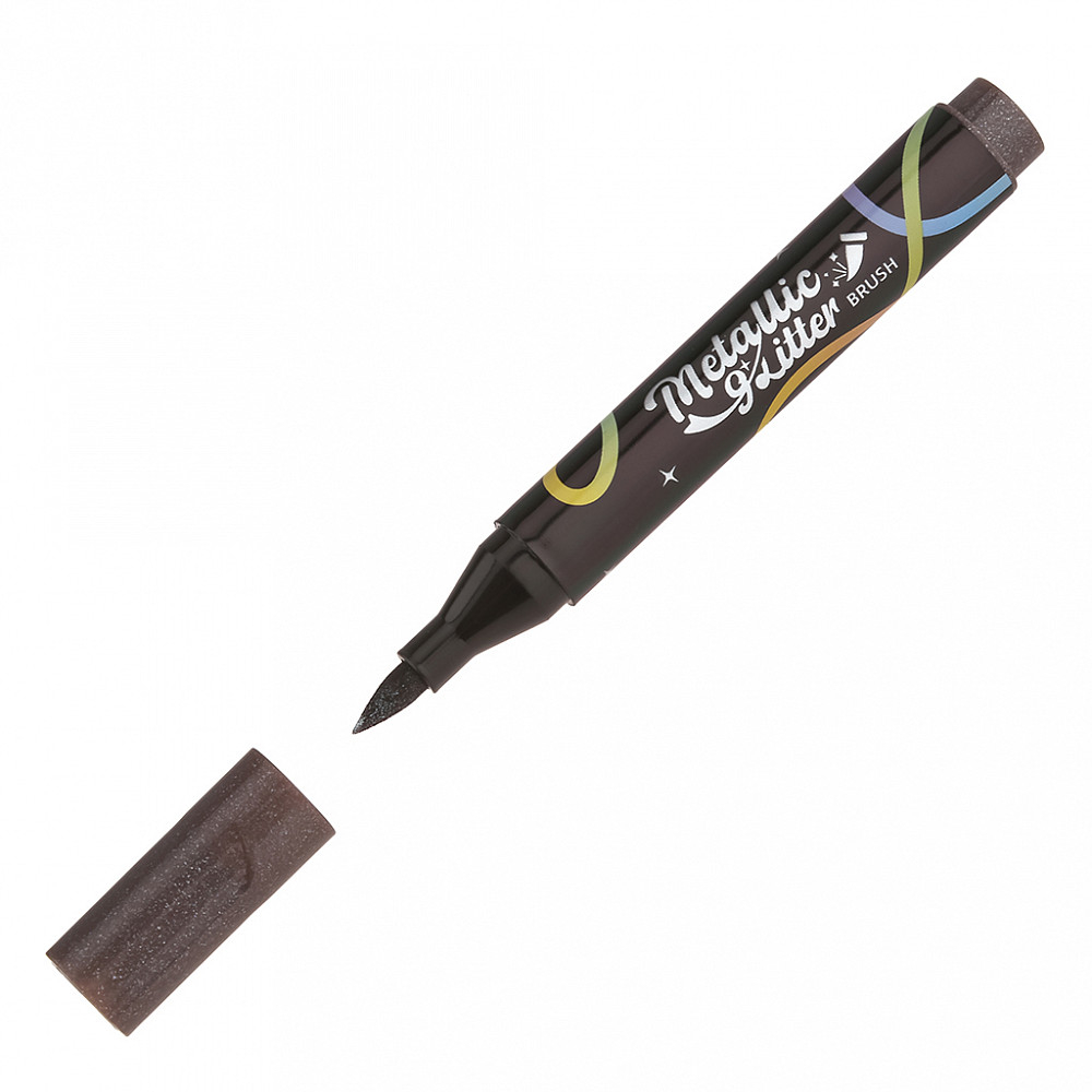 Маркер с наконечником‑кистью предназначен для нанесения надписей и рисунков на бумагу, ткань, металл и стекло: его гибкий пишущий узел позволяет варьировать толщину линии, а чернила обеспечивают устойчивое, водостойкое покрытие на разнообразных поверхностях.