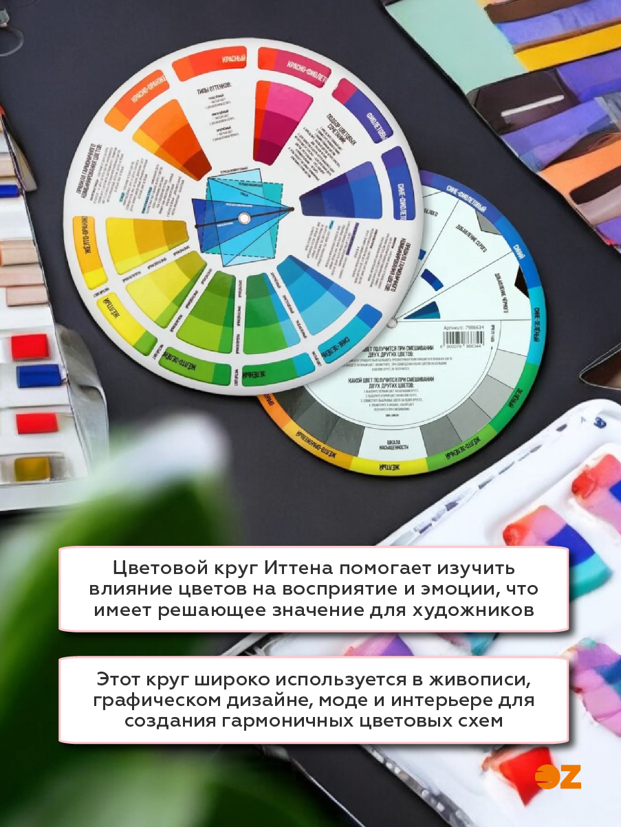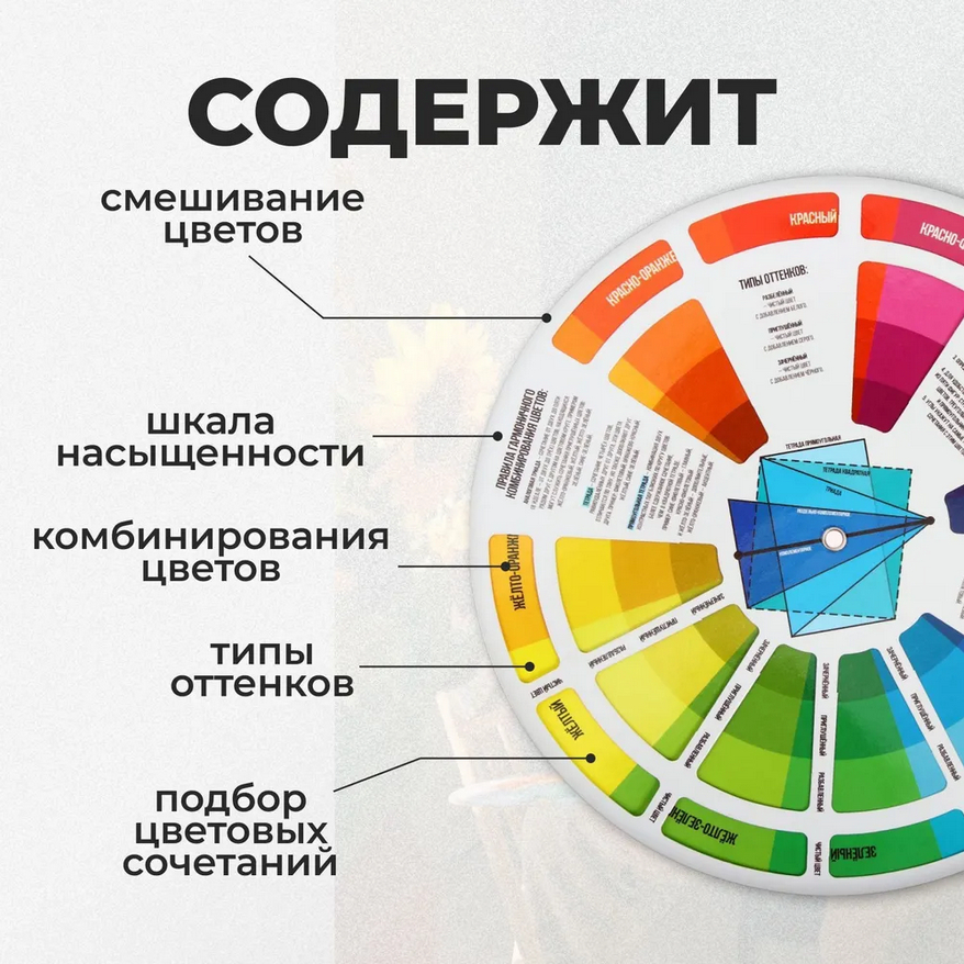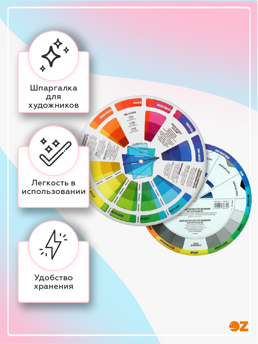 Цветовой круг изготовлен из плотного ламинированного картона и имеет 2 стороны.