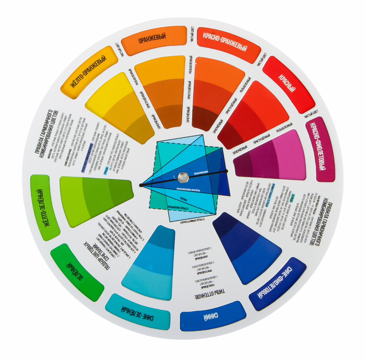На нем отображается следующая информация: правила гармоничного комбинирования цветов, типы оттенков, подбор цветовых сочетаний.