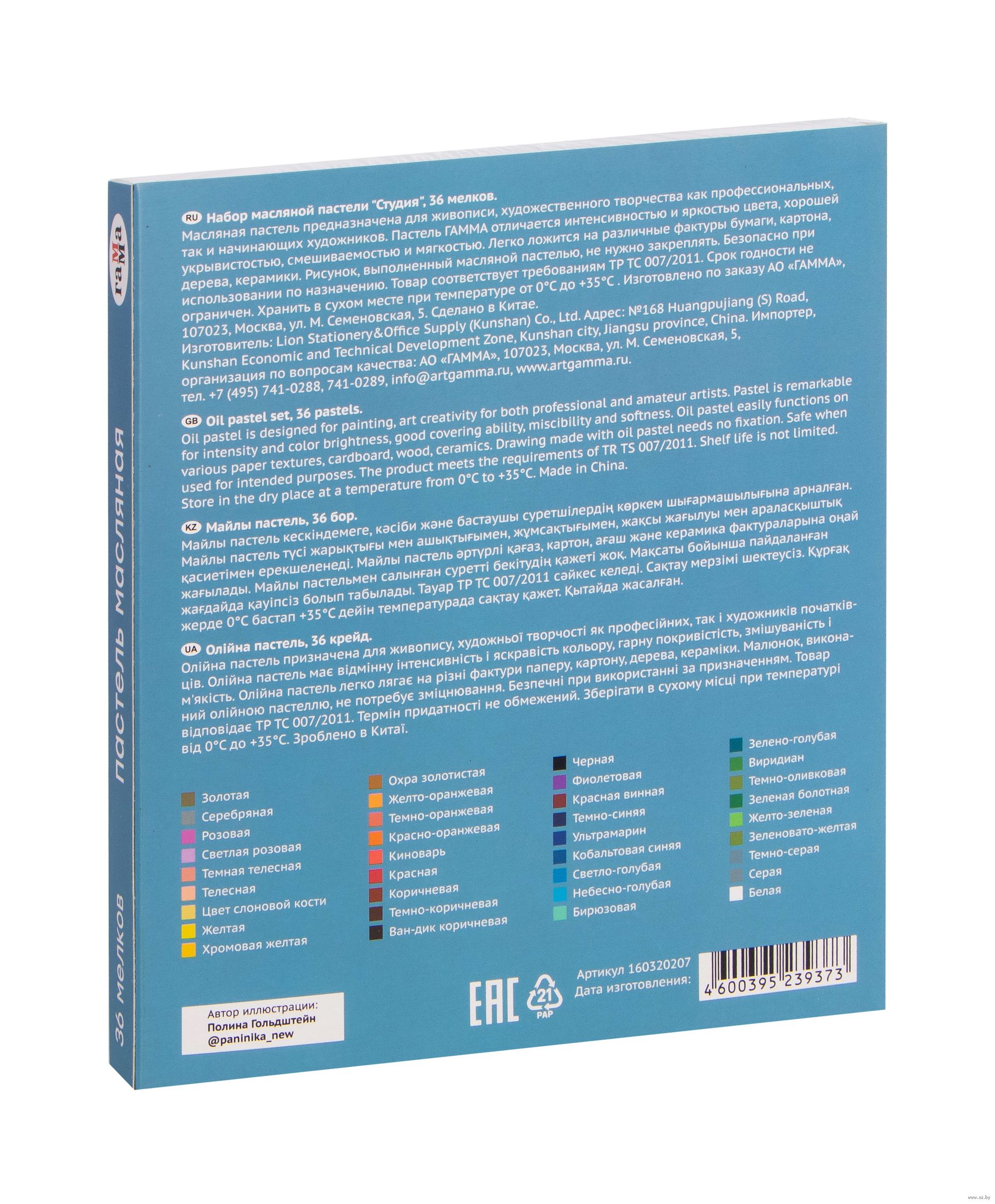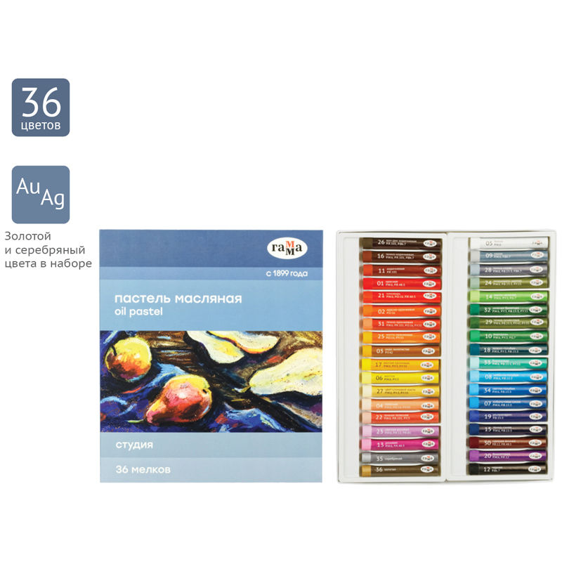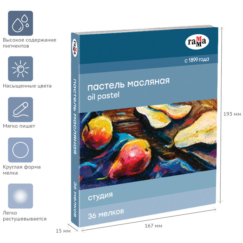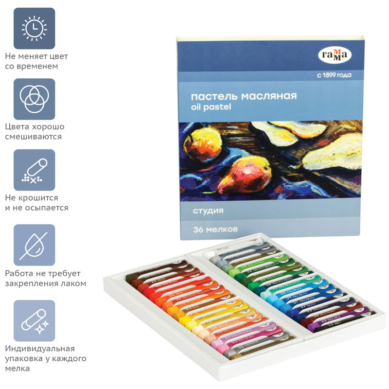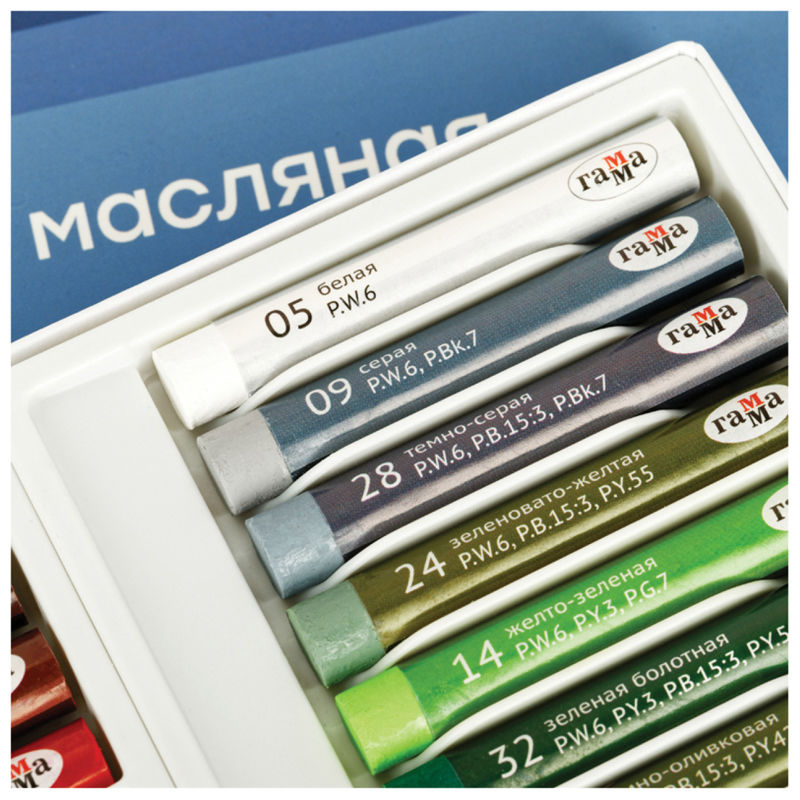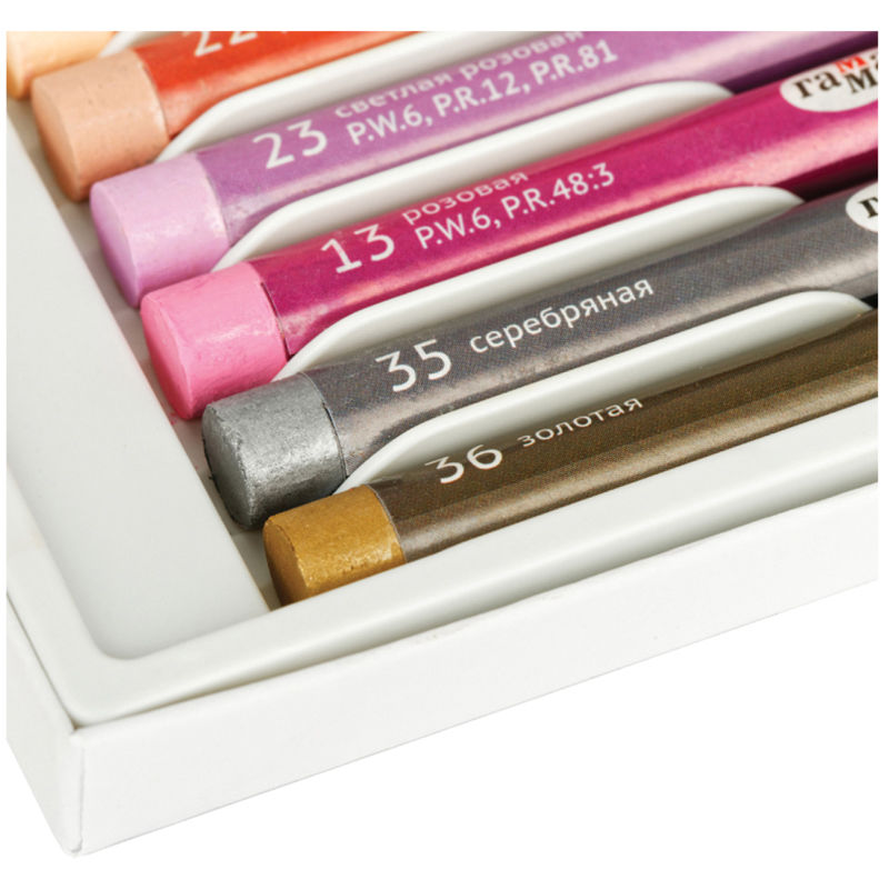 Масляная пастель "Студия" изготовлена на основе тонкотертых пигментов и минерального масла. Оставляет мягкий штрих, легко растушевывается.