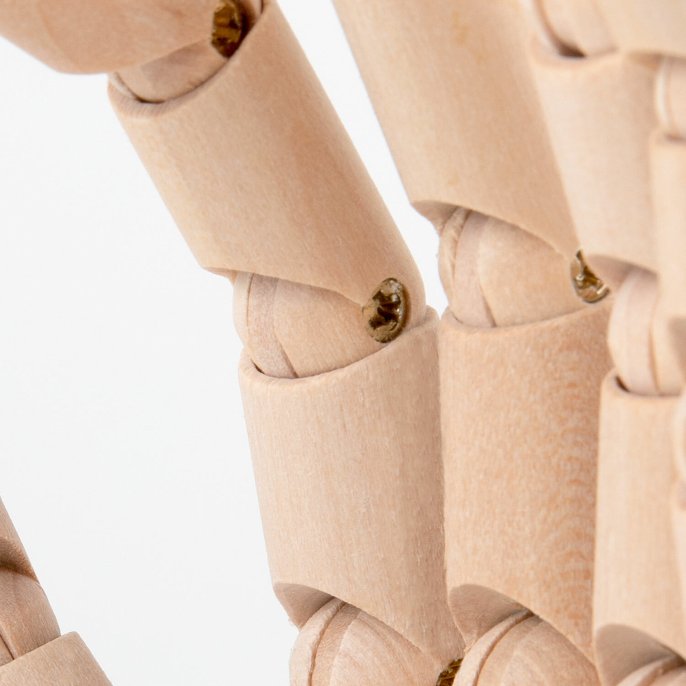 Манекен изготовлен из натурального дерева и представляет собой модель левой руки, которая может сгибаться в суставах пальцев и в области запястья. Соединения позволяют зафиксировать руку в необходимом положении.