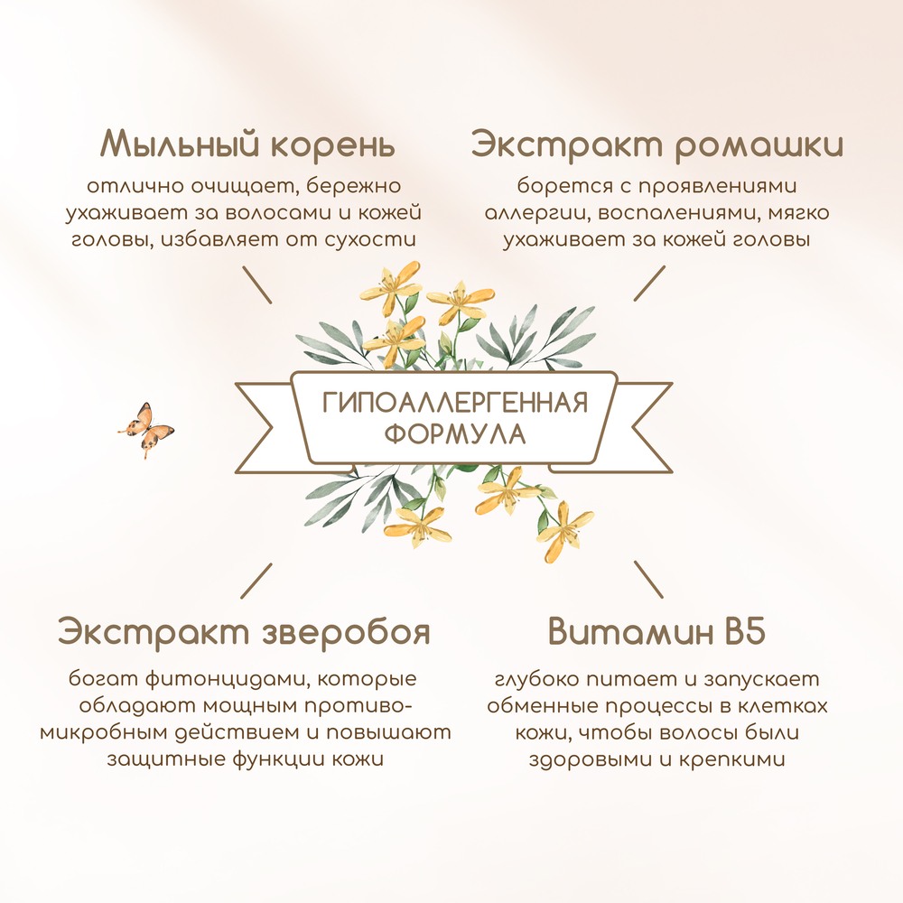 Aqua with infusions of Saponaria Officinalis Extract (экстракт мыльного корня), Chamomilla Recutita Extract (экстракт ромашки), Hypericum Perforatum Extract (экстракт зверобоя), Lauryl Glucoside, Hydrogenated Starch Hydrolysate, Glycerin, Cocamidopropyl Betaine, Coco-Glucoside, Glyceryl Oleate, Panthenol (витамин В5), Hydroxyethyl Urea (мочевина), Guar Hydroxypropyltrimonium Chloride, Hydrolyzed Wheat Protein (протеины пшеницы), Tocopheryl Аcetate (витамин Е), Allantoin (аллантоин), Citric Acid, Benzyl Alcohol, Sodium Benzoate, Potassium Sorbate. Parfum, Hexyl Cinnamal.
