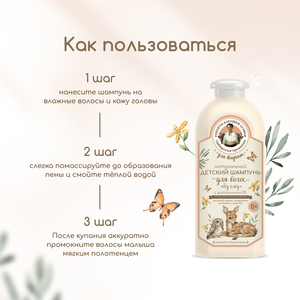 Нанесите шампунь на влажные волосы и кожу головы, слегка помассируйте до образования пены и смойте тёплой водой. После купания нежно промокните волосы малыша мягким полотенцем.Состав