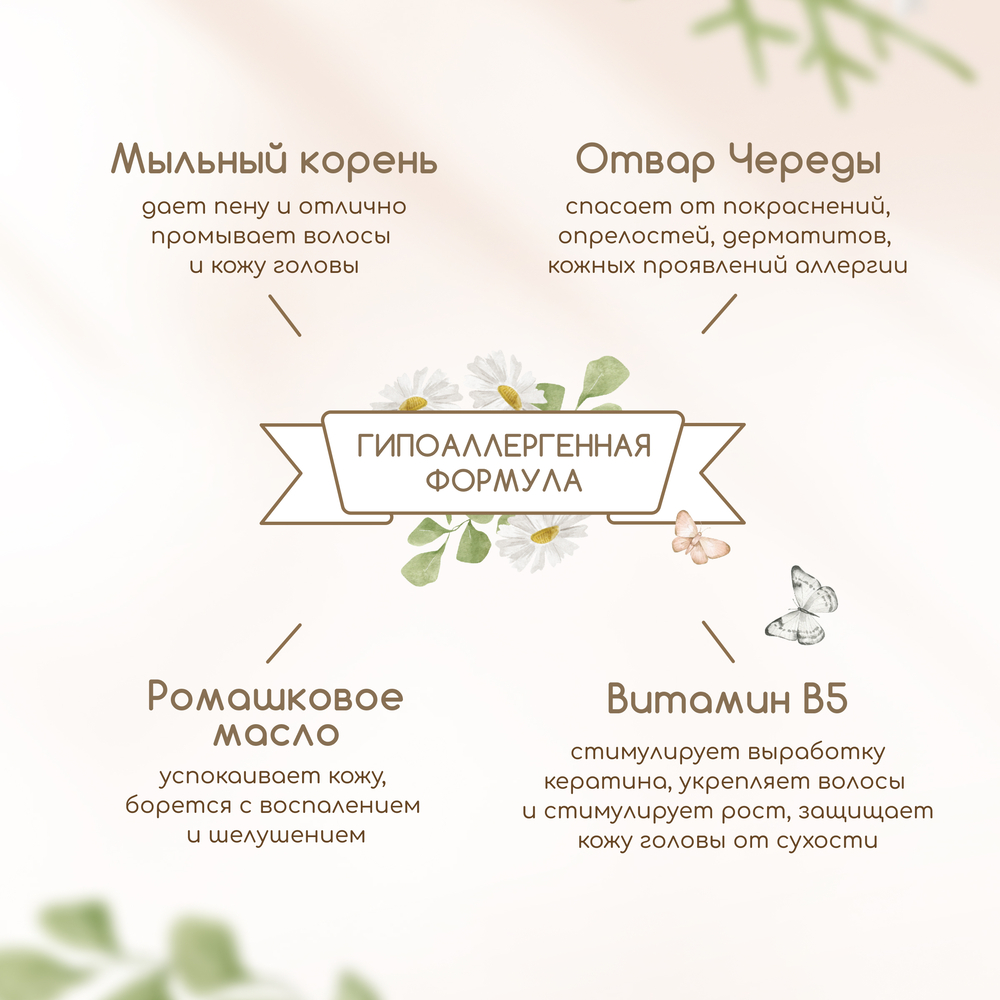 Aqua with infusions of Saponaria Officinalis Extract (экстракт мыльного корня), Bidens Tripartita Flower/Leaf/Stem Extract (отвар череды), Glycerin, Hydrogenated Starch Hydrolysate, Sodium Coco-Sulfate, Cocamidopropyl Betaine, Decyl Glucoside, Triticum Vulgare Germ Oil (масло зародышей пшеницы), Chamomilla Recutita Oil (ромашковое масло), Panthenol (витамин В5), Betaine, Coco-Glucoside, Glyceryl Oleate, Hydroxyethyl Urea (мочевина), Hydrolyzed Wheat Protein (протеины пшеницы), Guar Hydroxypropyltrimonium Chloride, Citric Acid, Benzyl Alcohol, Sodium Benzoate, Potassium Sorbate. Parfum, Hexyl Cinnamal, Linalool.