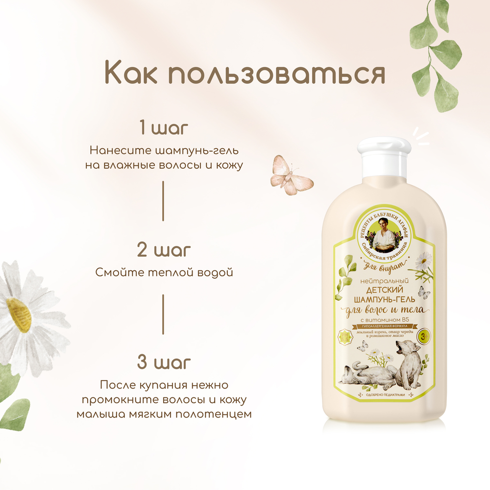 Нанесите шампунь-гель на влажные волосы и кожу ребёнка, вспеньте и смойте тёплой водой. После купания нежно промокните волосы и кожу малыша мягким полотенцем.Состав