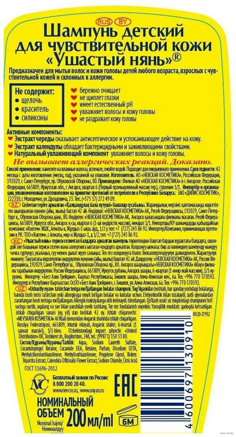 | Особенности состава | Без парабенов, без слез, без sls/sles, гипоаллергенный |