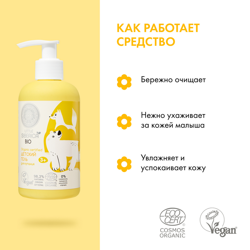 Чем наш гель отличается от остальных? Мы используем органические гидролаты растений Сибири, это концентрированный коктейль витаминов и микроэлементов, полученных путем дистилляции. В отличие от геля на обычной воде, он не только бережно очищает, но и ухаживает за кожей малыша.
