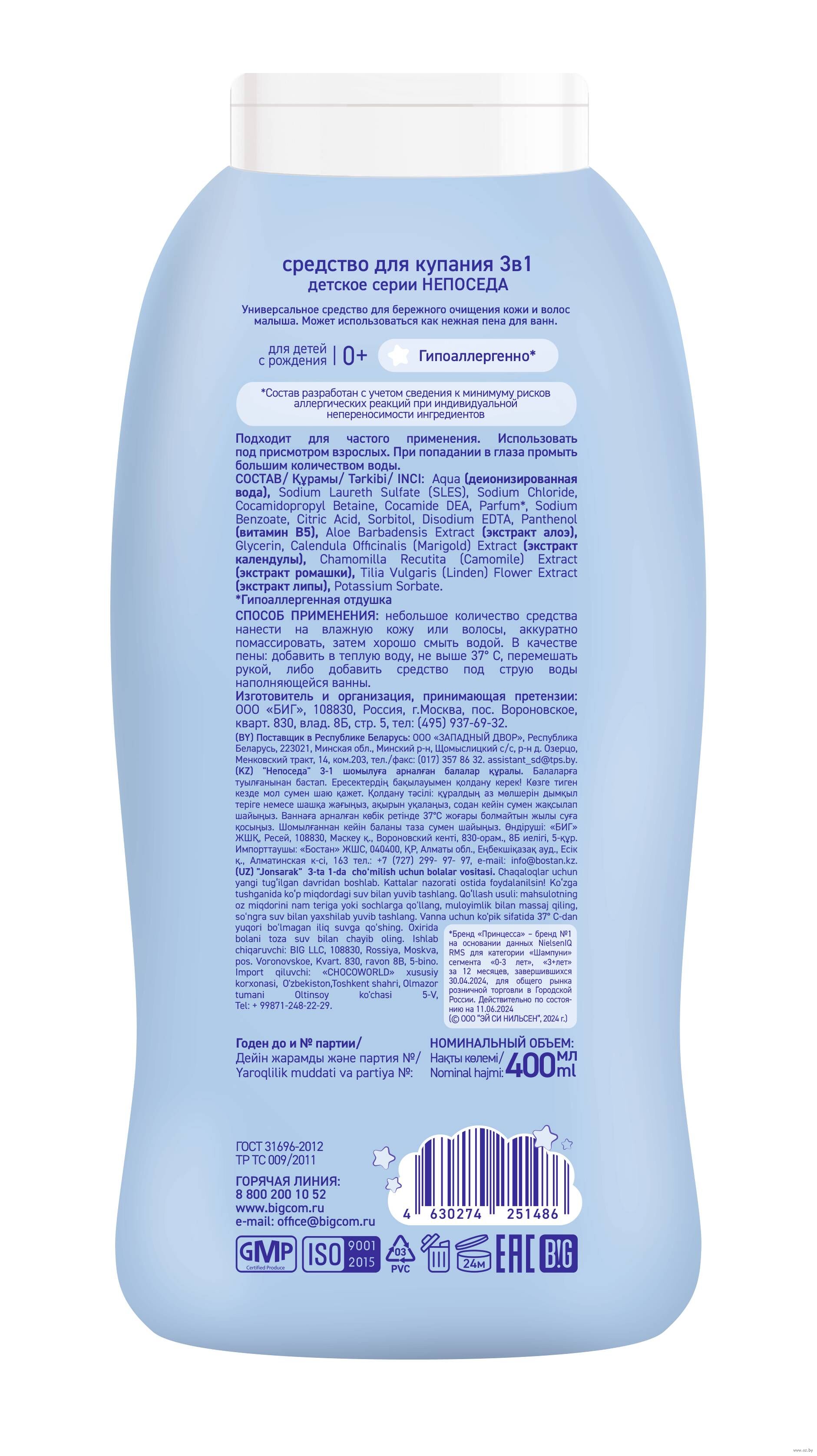 Не содержит SLS, парабены, метилы, красители и аллергены. Бережное очищение от макушки до самых пяточек, а также нежная пена для принятия вечерней ванны – все в одном флаконе.