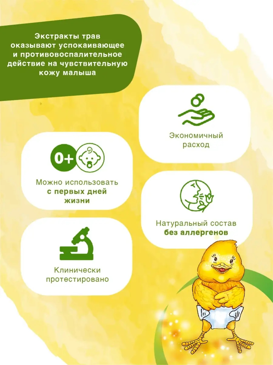 Экстракт трав оказывает успокаивающее и противовоспалительное действие на чувствительную кожу малыша.